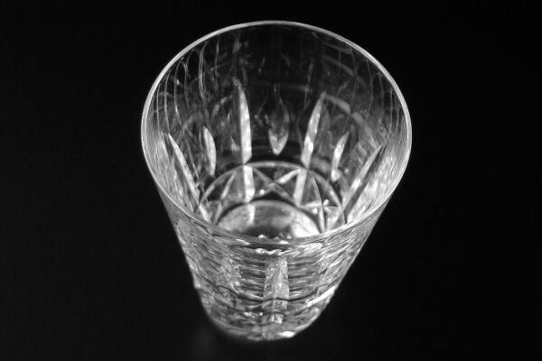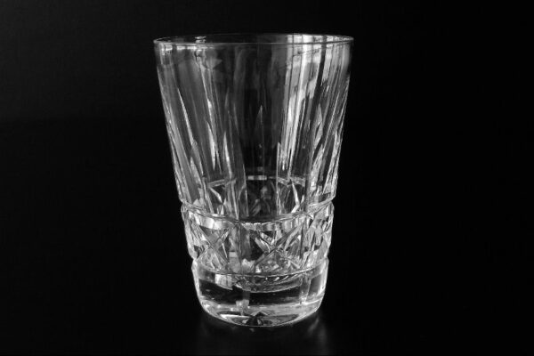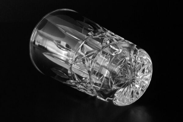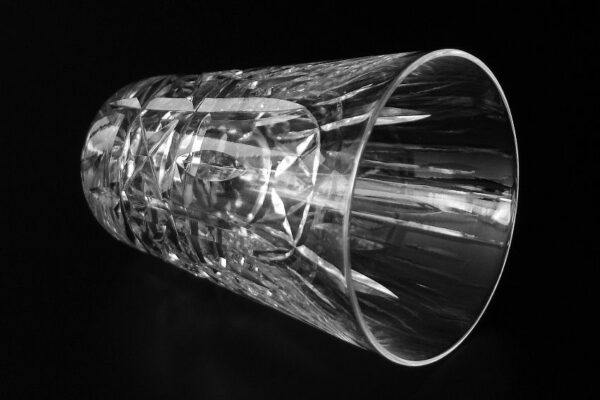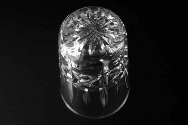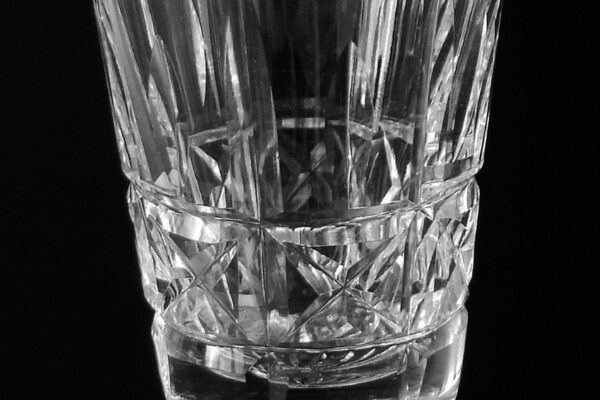 Dit kristallen whiskey- whiskyglas (tumbler) is gemaakt in Schotland in de tweede helft van de 20e eeuw (zestiger jaren). Het mondgeblazen handgeslepen en gepolijste whiskey- whiskyglas is in een dynamisch patroon geslepen en heeft aan de onderzijde een geslepen ster. Het whiskey- whiskyglas weegt 193 gram is 9.1 cm hoog en heeft een diameter van 6.2 cm. Dit model hoge smalle glazen zijn typisch voor Schotland en worden voornamelijk daar gebruikt.