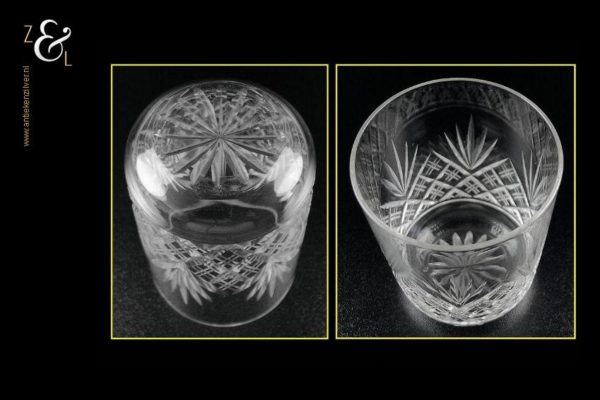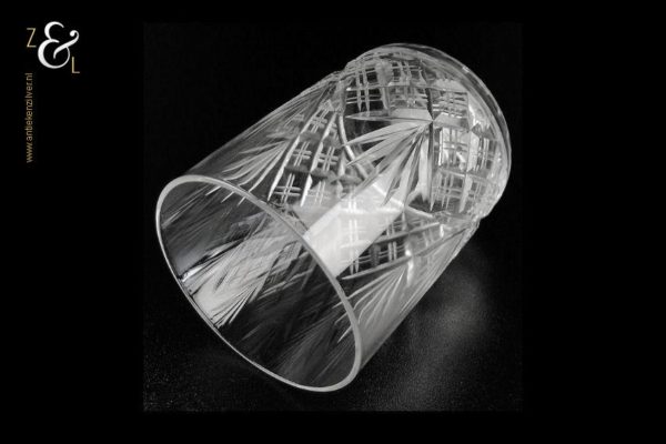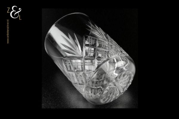 Dit kristallen whiskey- whiskyglas is in de eerste helft van de 20e eeuw (veertiger jaren) in Nederland gemaakt. Het mondgeblazen en in ruit en waaier handgeslepen en gepolijste glas weegt 98 gram is 9.2 cm hoog en heeft een diameter van 6.7 cm aan de onderzijde van dit glas is een ster geslepen.