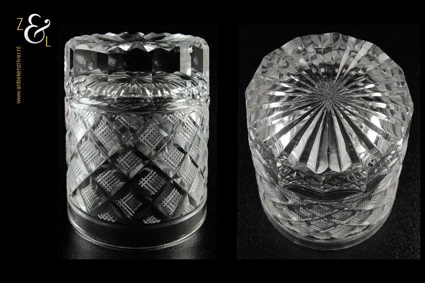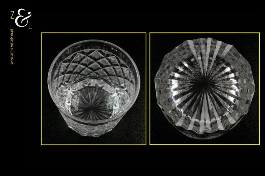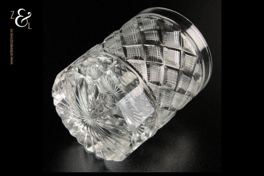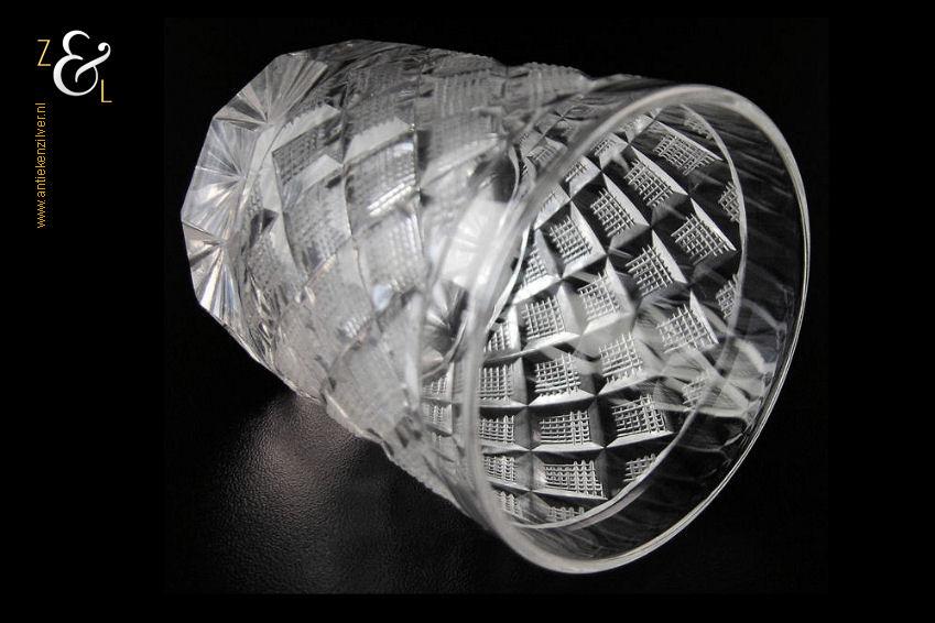 Deze kristallen whiskey- whiskytumbler is gemaakt in Luik / Seraing België bij de glasblazerij van Val Saint Lambert aan het begin van de 20e eeuw (rond 1920) de Art Deco periode. De mondgeblazen handgeslepen en gepolijste whiskey- whiskytumbler is ruitgeslepen en heeft aan de onderzijde van het glas een geslepen ster die tot aan de rand doorloopt. De tumbler weegt 164 gram is 7.4 cm hoog en heeft een diameter van 6.1cm.
