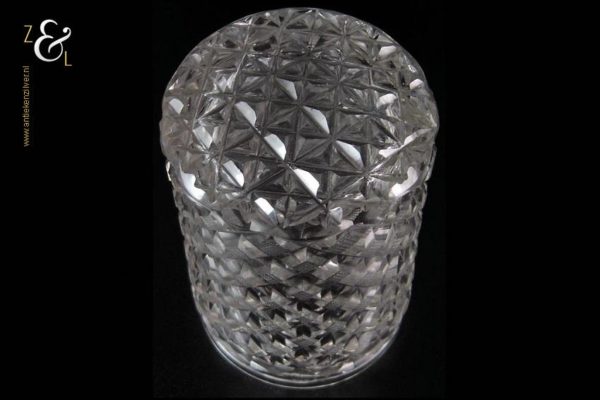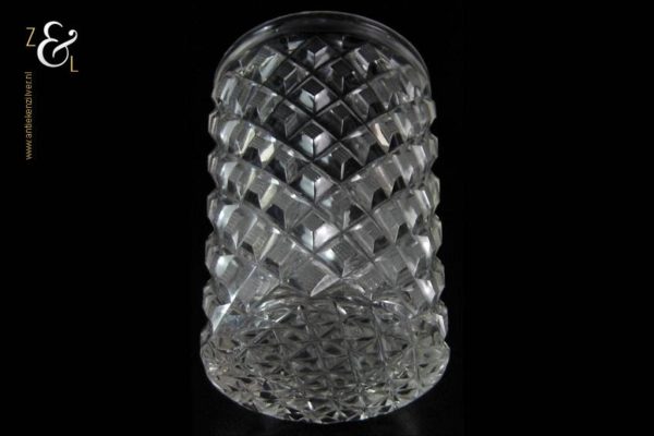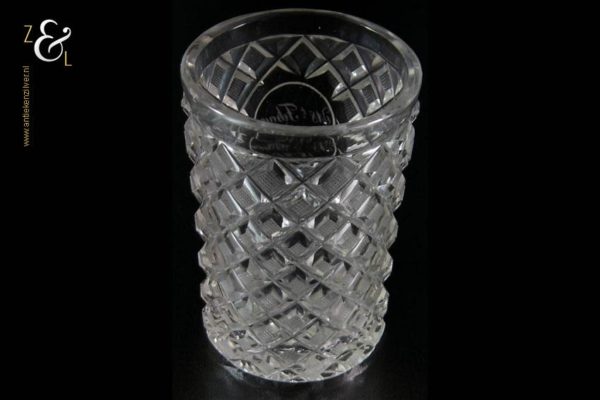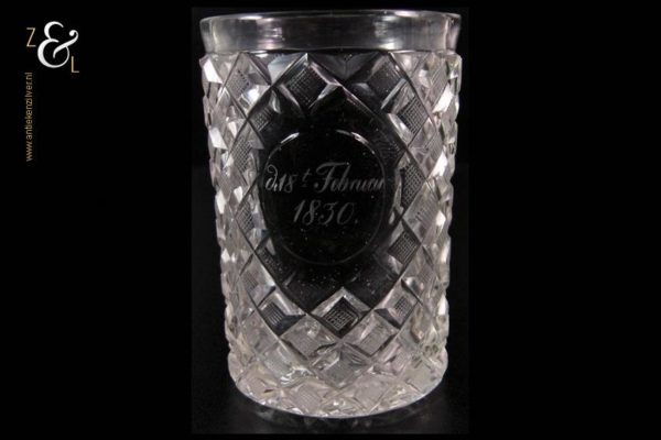 Dit whiskey- whiskyglas is afkomstig uit Ierland en stamt uit de eerste helft van de 19e eeuw. Het mondgeblazen geheel ruitgeslepen (ook de bodem is ruitgeslepen) kristallen glas is uitgevoerd met een medaillon waarin 18t februar 1830 gegraveerd is. Het glas weegt 276 gram is 10.3 cm hoog en heeft een diameter van 7 cm.