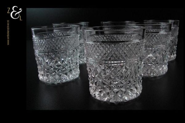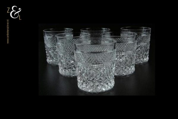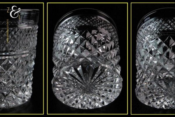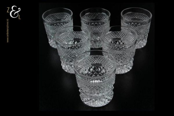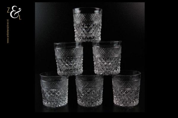 Deze zes kristallen whiskey- whiskytumblers zijn gemaakt in Luik / Seraing België bij de glasblazerij van Val Saint Lambert aan het begin van de 20e eeuw (rond 1920) de Art Deco periode. De mondgeblazen handgeslepen en gepolijste whiskey- whiskytumblers zijn ruitgeslepen en hebben aan de onderzijde een geslepen ster die tot aan de rand doorloopt. De tumblers wegen samen 790 gram zijn 6.2 cm hoog en hebben een diameter van 5.7 cm. Door de kleine afmeting van deze glazen kunnen ze ook heel goed gebruikt worden als zogenaamde “Shot glazen” voor bijvoorbeeld Wodka, Gin enzovoorts.