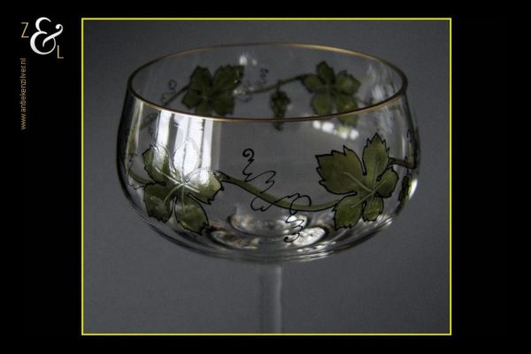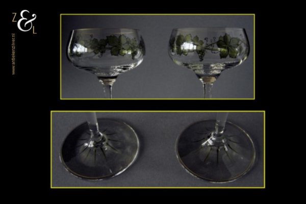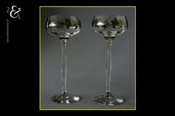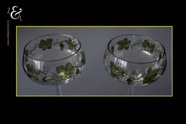 Dit stel kristallen wijnglazen is gemaakt in de kristalfabriek van Theresienthal te Zwiesel Duitsland. De glazen worden weergegeven onder nummer 1496 in de prijslijst van 1903 het jaar waarin ze ontworpen zijn. De mondgeblazen, op de hand gepolijste en met transparante druiventrossen en bladeren beschilderde en geëmailleerde glazen zijn 20.2 cm hoog en hebben een voet met een diameter van 7.5 cm ze wegen samen 300 gram. De wijnglazen hebben een vergulde rand op zowel de kelk als voet en werden gebruikt om er witte Rijnwijn uit te drinken.