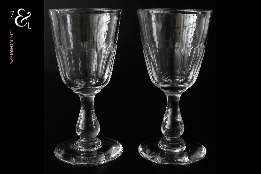 Dit stel mondgeblazen en geheel op de hand vervaardigde wijnglazen / portglazen is gemaakt in Nederland of Engeland en stamt uit het eind van de 19e eeuw en het begin van de 20e eeuw. De handgeslepen en gepolijste glazen hebben een kelk met elf ribben en een balustervormige steel. Het stel wijnglazen / portglazen weegt samen 242 gram en is 11.8 cm hoog. De kelken hebben een diameter van 5.7 cm en de voeten hebben een diameter van 5.6 cm. Het stel antieke wijnglazen / portglazen is op ambachtelijke wijze mondgeblazen en op de hand vervaardigd, hierdoor kunnen er kleine imperfecties optreden en hebben de glazen onderling een klein verschil in maat en gewicht.