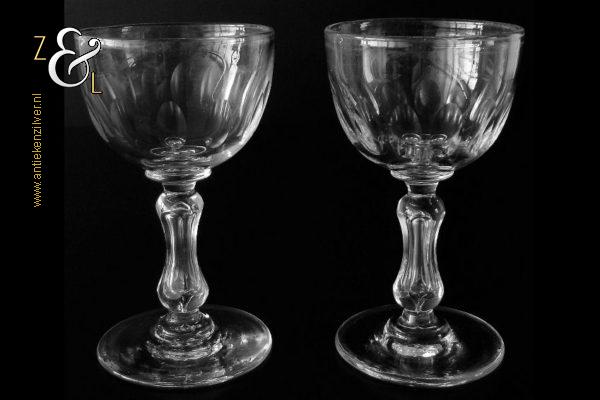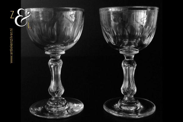 Dit stel mondgeblazen en geheel op de hand vervaardigde wijnglazen / portglazen model Stephenson is gemaakt bij de Glasfabriek Leerdam en stamt uit het begin van de 20e eeuw. De handgeslepen en gepolijste glazen hebben een zeskantige balustervormige steel en een ronde kelk waarvan er één met dertien en één met met veertien olijven geslepen is. Het stel wijnglazen / portglazen weegt samen 242 gram en is 11.5 cm hoog. De kelken hebben een diameter van 6.5 cm en de voeten hebben een diameter van 6.2 cm. Het stel antieke wijnglazen / portglazen is op ambachtelijke wijze mondgeblazen en op de hand vervaardigd, hierdoor kunnen er kleine imperfecties optreden en hebben de glazen onderling een klein verschil in maat en gewicht.