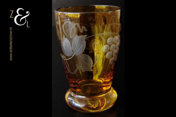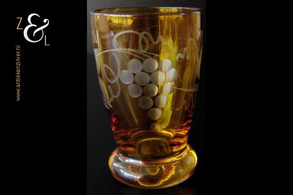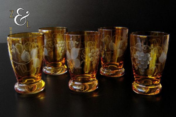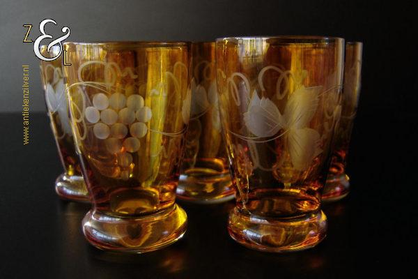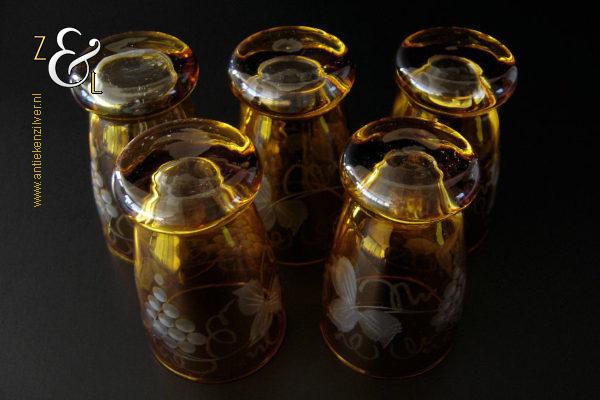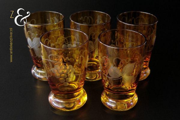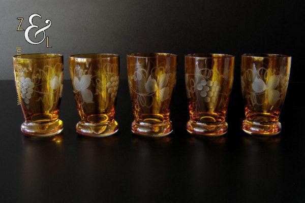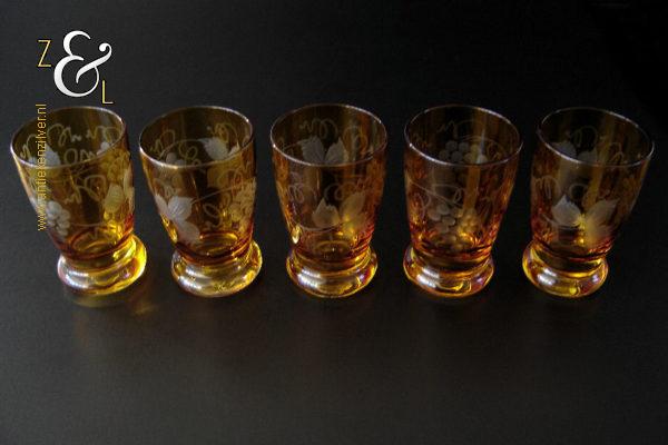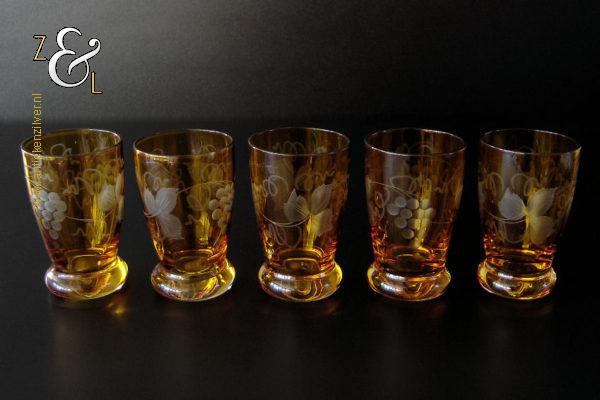 Deze vijf kristallen wijnglazen / portglazen zijn gemaakt in Duitsland en stammen uit de vijftiger jaren. De met druivenranken en bladeren handgeslepen en gepolijste glazen zijn uitgevoerd in blank kristal met een amberkleurige overvang*. De vijf wijnglazen / portglazen wegen samen 442 gram hebben een diameter van 5 cm en zijn 8 cm hoog. De vijf wijnglazen / portglazen zijn op ambachtelijke wijze op de hand in een vorm mondgeblazen, hierdoor kunnen er kleine imperfecties optreden en hebben de glazen onderling een klein verschil in gewicht.