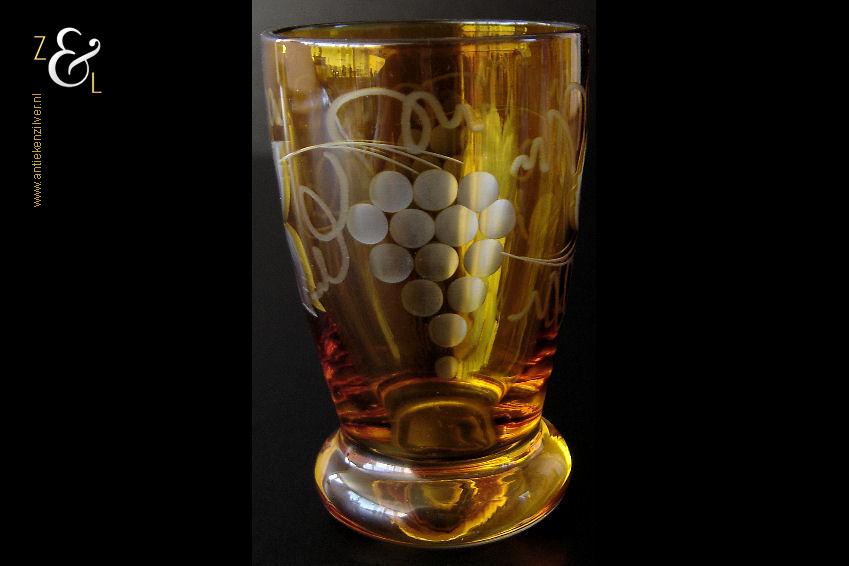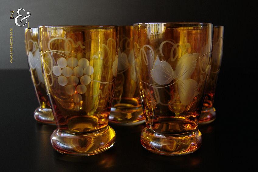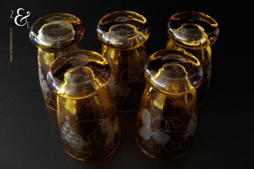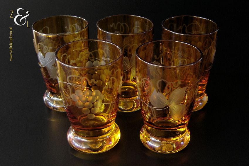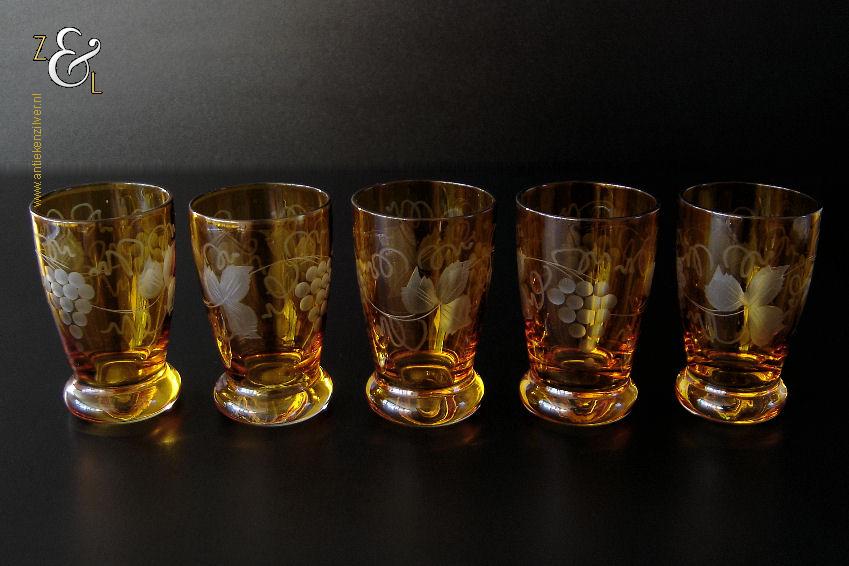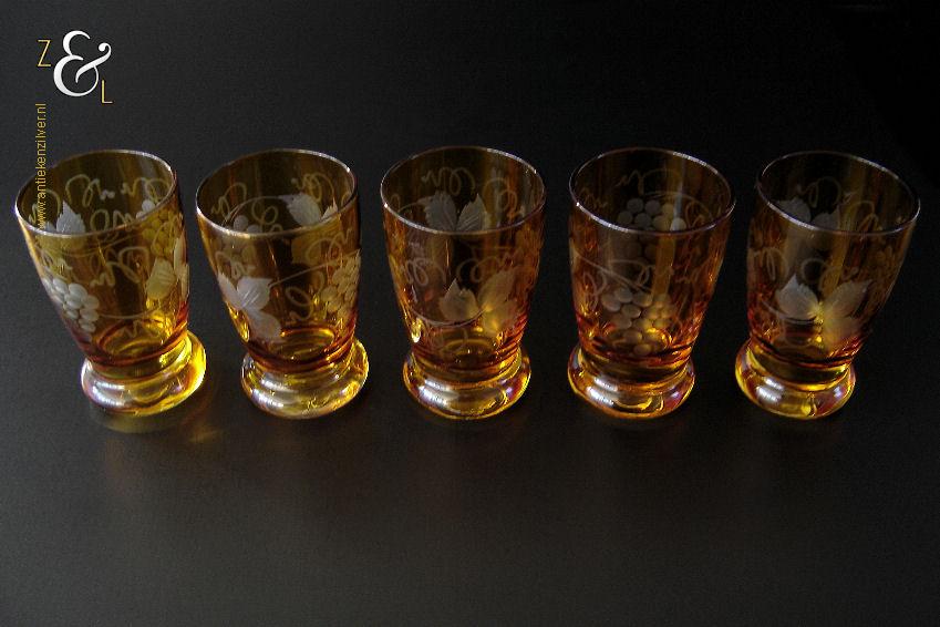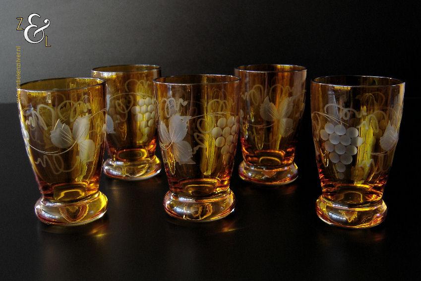 Deze vijf kristallen wijnglazen / portglazen zijn gemaakt in Duitsland en stammen uit de vijftiger jaren. De met druivenranken en bladeren handgeslepen en gepolijste glazen zijn uitgevoerd in blank kristal met een amberkleurige overvang*. De vijf wijnglazen / portglazen wegen samen 442 gram hebben een diameter van 5 cm en zijn 8 cm hoog. De vijf wijnglazen / portglazen zijn op ambachtelijke wijze op de hand in een vorm mondgeblazen, hierdoor kunnen er kleine imperfecties optreden en hebben de glazen onderling een klein verschil in gewicht.