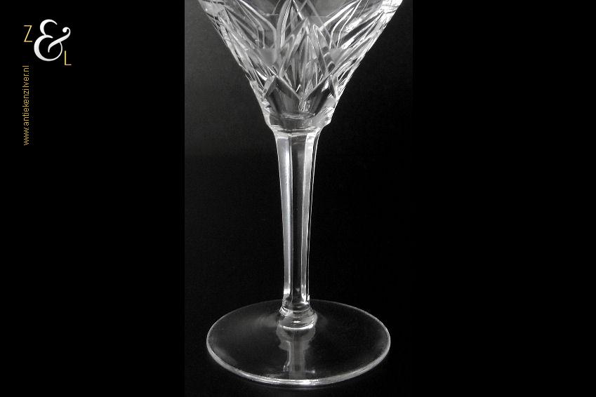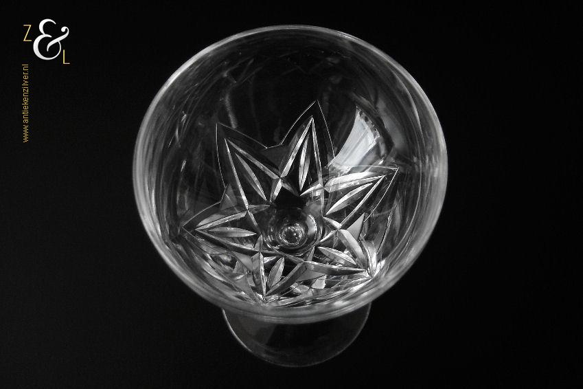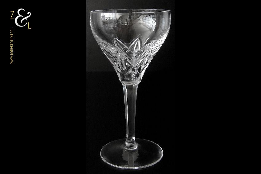 Dit wijnglas is gemaakt in Nederland en stamt uit de tweede helft van de 20e eeuw omstreeks de zestiger- zeventiger jaren. Het in Art Deco stijl en in helder kristal vervaardigde wijnglas heeft een ronde voet, zeskantige steel en een kelk met daarop een handgeslepen stermotief. Het wijnglas weegt 168 gram en is 14.5 cm hoog. De kelk heeft een diameter van 7.5 cm de voet heeft een diameter van 6.5 cm. Het wijnglas heeft gebruikssporen (krasjes in de kelk).