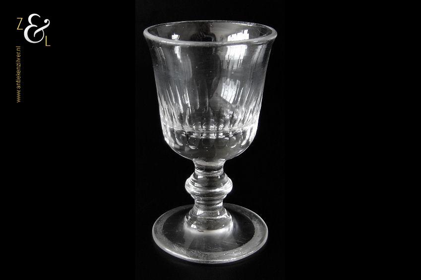 Dit mondgeblazen en geheel op de hand vervaardigde wijnglas / portglas is gemaakt in Nederland of Engeland en stamt uit het eind van de 19e eeuw en het begin van de 20e eeuw. Het zwaar uitgevoerde handgeslepen en gepolijste glas heeft een kelk met tweeëntwintig ribben en een steel met in het midden een mooi gevormde dikke knoop. Aan de onderzijde van de voet zit een in de vorm van een lens weggeslepen pontilmerk. Het wijnglas / portglas weegt 142 gram en is 10.1 cm hoog. De kelk heeft een diameter van 5.7 cm en de voet heeft een diameter van 5.7 cm.