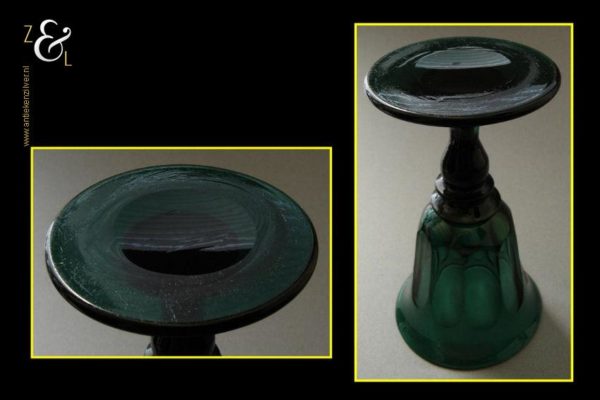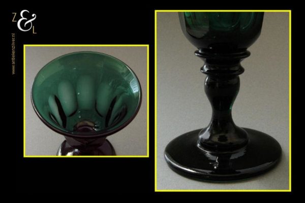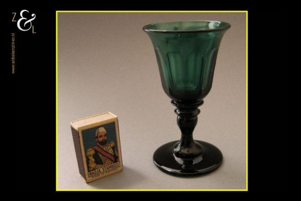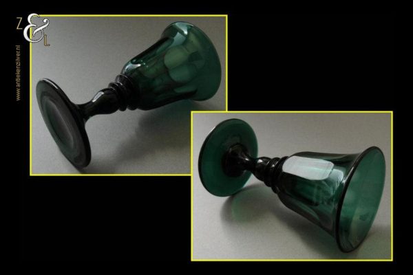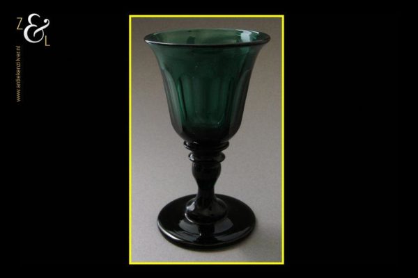 Dit groen kristallen wijnglas / portglas is gemaakt in Engeland en stamt uit het midden van de 19e eeuw. Het mondgeblazen, handgeslepen en gepolijste glas heeft aan de kelk negen geslepen ribben een balustervormige steel en aan de onderzijde van de voet een weggeslepen pontil merk. Het glas weegt 180 gram is 12.6 cm hoog heeft aan de bovenkant een diameter van 7.3 cm en de voet heeft een diameter van 6.5 cm.