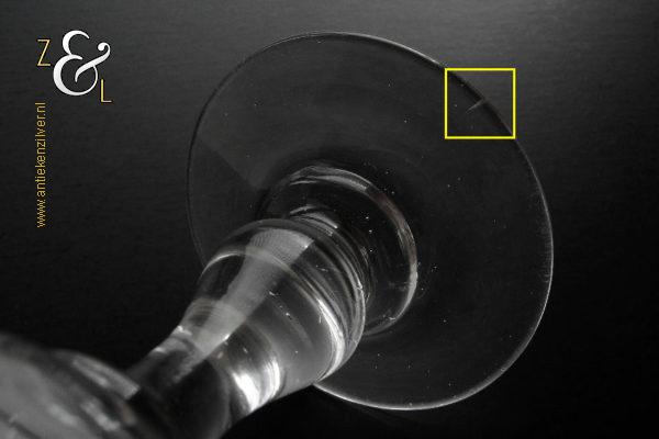 Het wijnglas / portglas heeft een niet door en door klein barstje op de rand van de voet (dit is mogelijk al tijdens het maken van het glas gebeurd) zie geel omkaderd gedeelte op afbeelding.