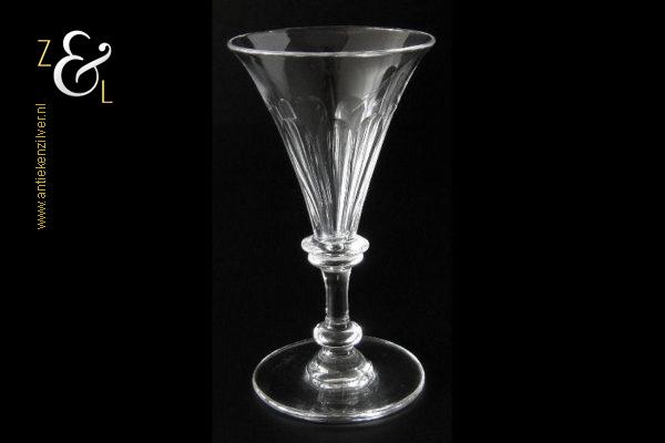 Dit mondgeblazen en geheel op de hand vervaardigde model paraplu wijnglas / portglas is gemaakt in Nederland en stamt uit de eerste helft van de 20e eeuw. Het handgeslepen en gepolijste glas heeft een kelk met negen ribben. De steel heeft aan de onderzijde een knoop en aan de onderkant van de kelk een dubbele scherp gehoekte knoop. Aan de onderzijde van de voet zit een in de vorm van een lens weggeslepen pontilmerk. Het wijnglas / portglas weegt 100 gram en is 13.1 cm hoog. De kelk heeft een diameter van 7.1 cm en de voet heeft een diameter van 6.5 cm.