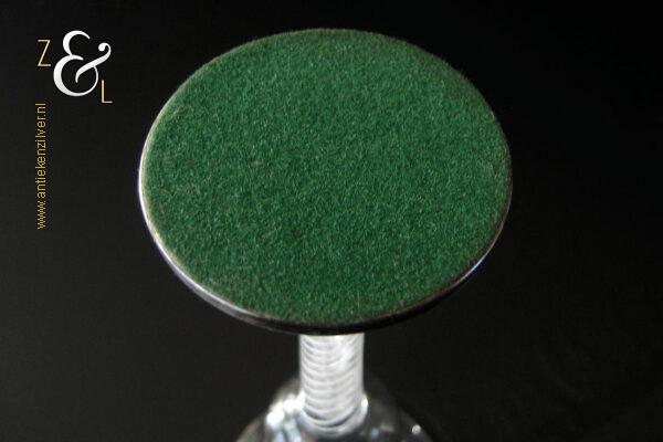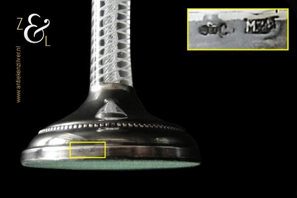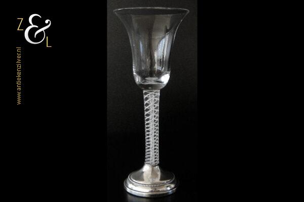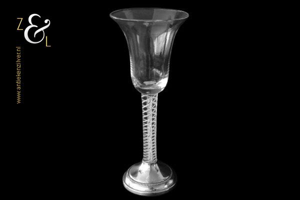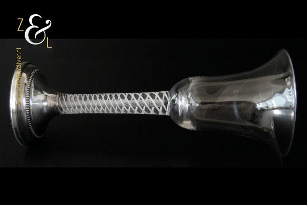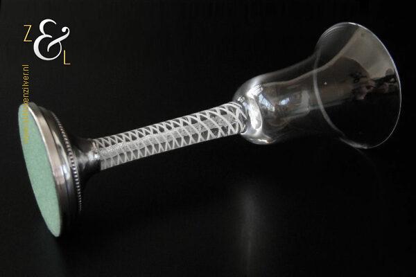 Het glas plus voet weegt 164 gram is 17.1 cm hoog en de kelk van het glas heeft een diameter van 6.9 cm. De diameter van de zilveren voet is 5.5 cm. Het glas heeft lichte gebruikssporen horizontale krasjes in de kelk maar verder is het glas in uitstekende staat.