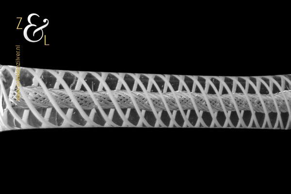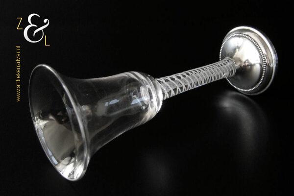 Omdat de antieke slingerglazen in hun tijd al veel geld waard waren, werden deze niet weggegooid maar gerepareerd met een zilveren montuur. Zo ook met dit glas waarvan de voet mogelijk afgebroken of beschadigd (schilfers) was.
