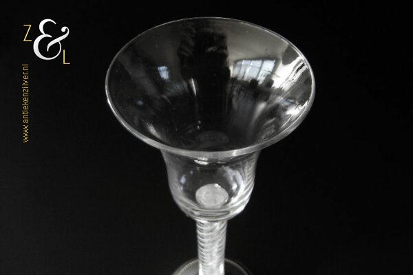 Dit wijnglas / slingerglas is gemaakt in Nederland van sodaglas en stamt uit de tweede helft van de achtiende eeuw tussen 1750 en 1770. Het zogenaamde slingerglas heeft een steel met spiraal die is uitgevoerd met in het midden een luchtkousje en daaromheen een enkele witte slinger van opaakglas.