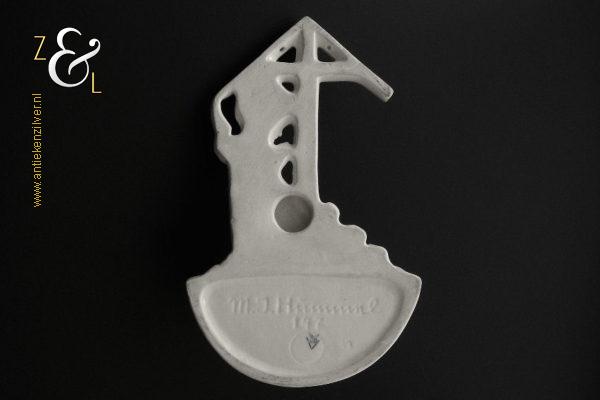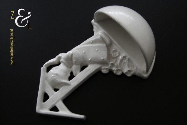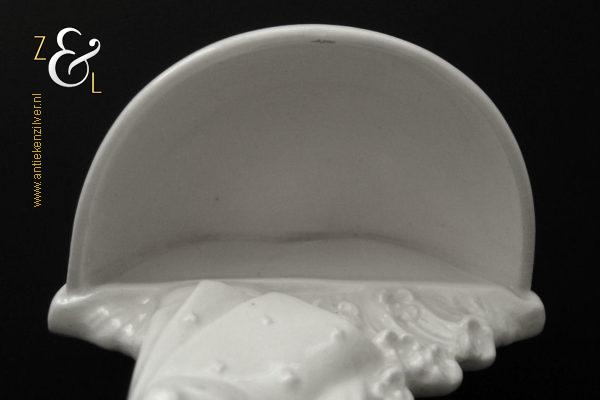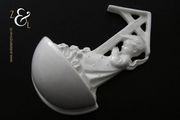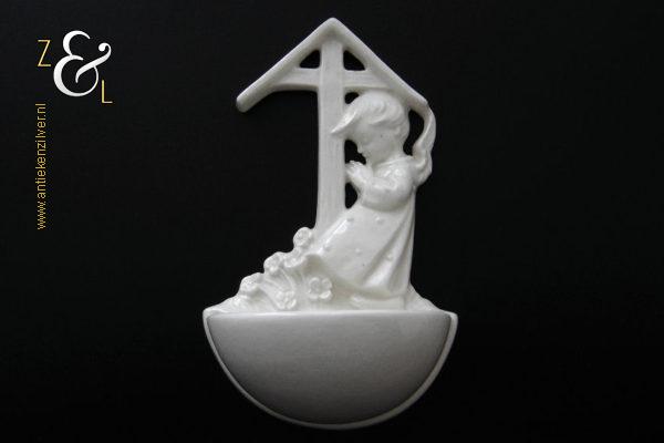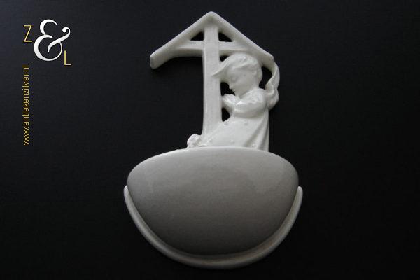 Het wijwaterbakje modelnummer 147 werd in verschillende kleurvarianten uitgegeven. Hier hebben wij het niet gedecoreerde, glanzend wit geglazuurde variant.