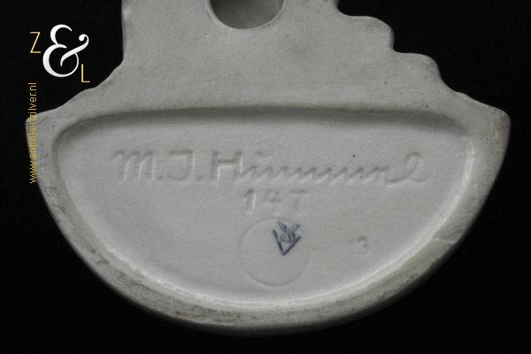 Dit Hummel wijwaterbakje model engel is gemaakt door de Goebel Porseleinfabriek in Oeslau Rödental West-Duitsland. Het porseleinen wijwaterbakje draagt aan de achterkant in reliëf het modelnummer 147 en het handelsmerk TM2 dat tussen 1950 en 1955 in gebruik was. Tevens is het wijwaterbakje in reliëf gesigneerd met M.I. Hummel. Het wijwaterbakje naar het ontwerp van zuster Maria Innocentia Hummel is in 1941 gecreëerd door beeldhouwer Reinhold Unger. Het wijwaterbakje weegt 128 gram en is 14.5 cm hoog bij 8.8 cm breed bij 5.3 cm diep. Het wijwaterbakje heeft een lichte craquelure.
