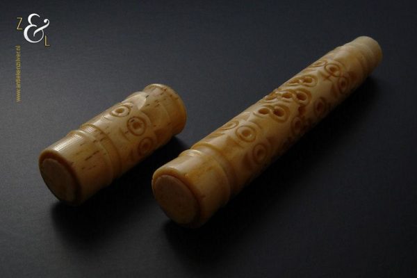 Deze ajour (opengewerkte) naaldenkoker is gemaakt in Engeland en stamt uit het einde van de 19e eeuw de Victoriaanse periode die liep van 1837 tot 1901. De in been uitgevoerde handgesneden naaldenkoker weegt 14 gram heeft een diameter van 1.3 cm en is 9.3 cm lang. De dop heeft een schroefdraad en is 3.2 cm lang.