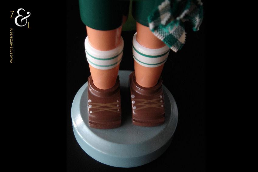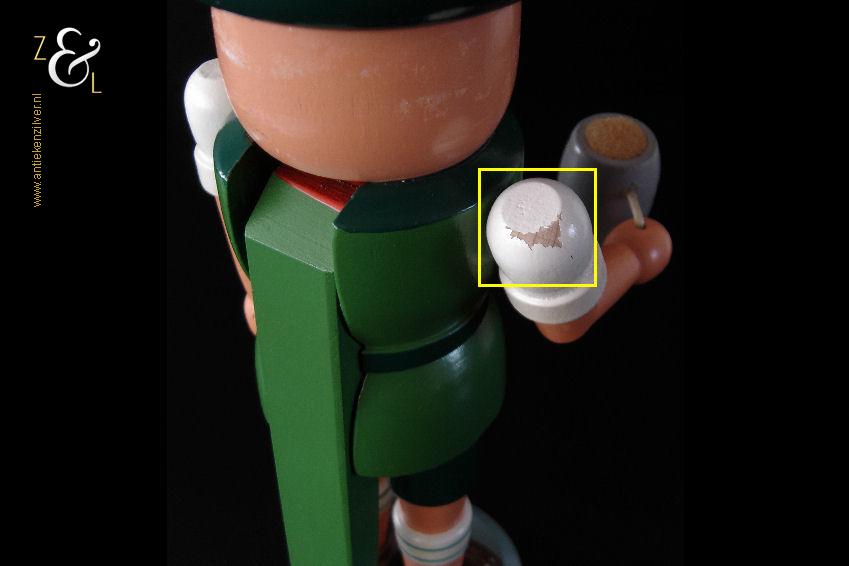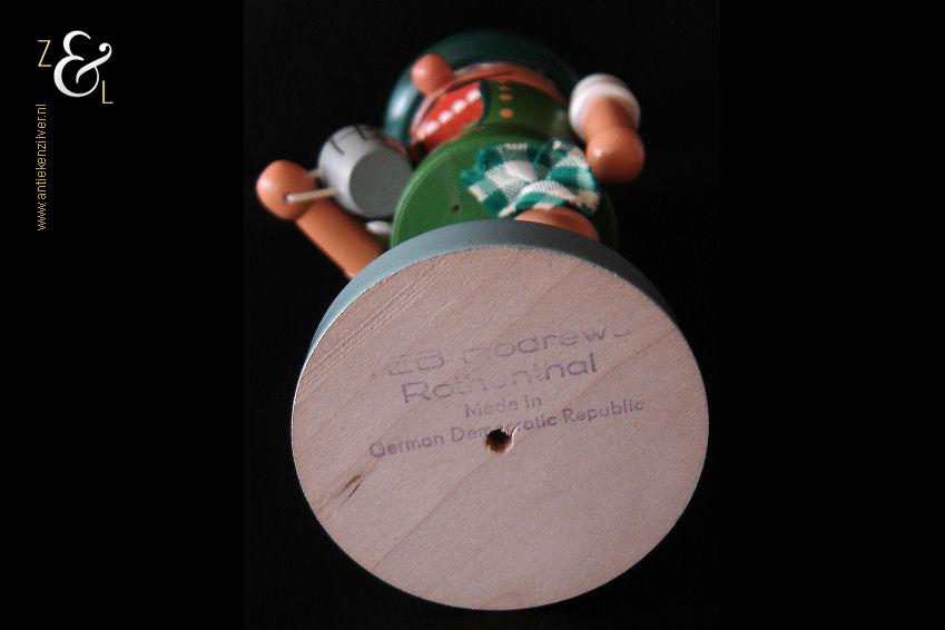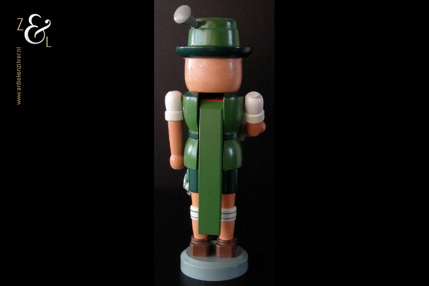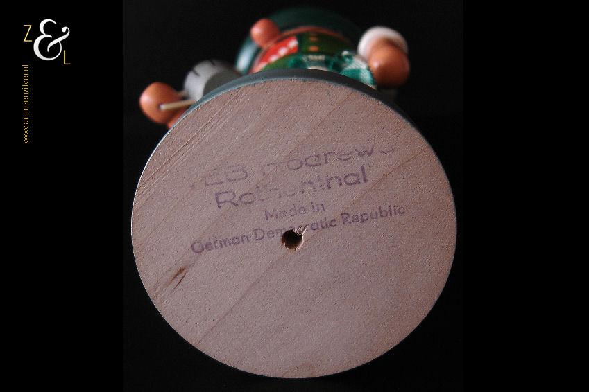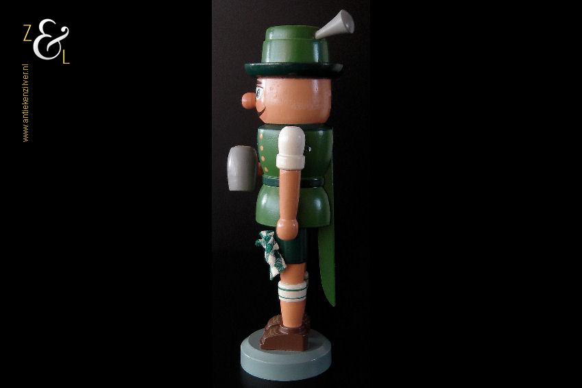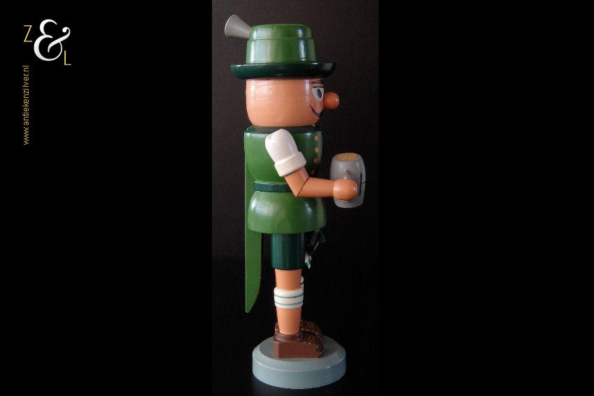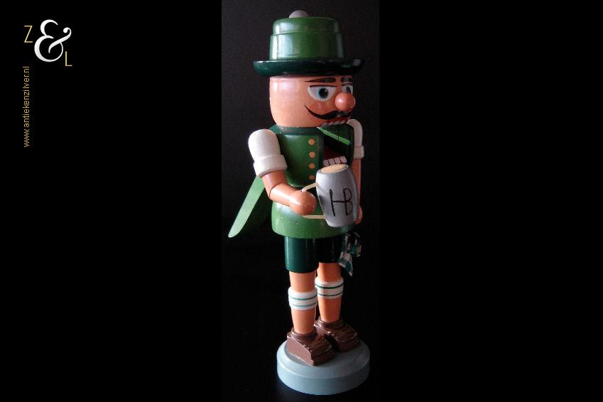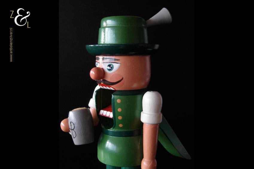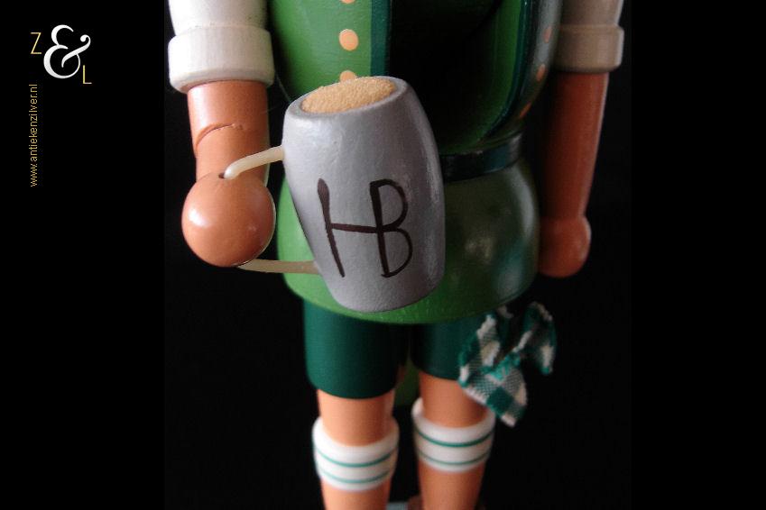 Deze notenkraker “Oktoberfest” is gemaakt in het Ertsgebergte van de voormalige DDR (Duitse Democratische Republiek) bij VEB Hodrewa Rothenthal. De authentieke houten vintage kerstnotenkraker die uit de zeventiger jaren stamt, beeldt een Beierse bierdrinker met lederhosen uit en heeft in zijn rechterhand een bierpul van HB Hofbräuhaus München. Dit soort notenkrakers werden gebruikt tijdens de kerstdagen en dienden tevens ter decoratie. De notenkraker die met de hand gedraaid, gepolijst, beschilderd en gedecoreerd is weegt 344 gram en is 26.5 cm hoog. De onderkant van de notenkraker is gemerkt met een stempel VEB Hodrewa Rothenthal German Democratic Republic. Van de notenkraker is het haar en baard van konijnenvacht (haren vielen uit) verwijderd. Tevens heeft de notenkraker een kleine verfchip op de arm (zie geel omkaderd gedeelte op afbeelding).