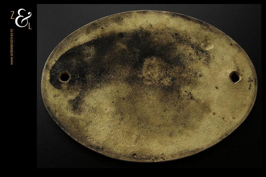 Deze gedetailleerde in messing gegoten ovale plaquette met het opschrift “T. Withers and Sons, Est 1855 West Bromwich” heeft vroeger de deur van een kluis of brandkast gesierd. De messing plaquette die uit het eind van de 19e begin 20e eeuw stamt is 14.6 cm lang en 10.5 cm breed en weegt 201 gram. Thomas Withers was een brandkast kluis en slotenmaker gevestigd in West Bromwich Engeland.