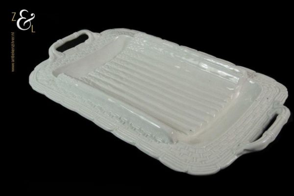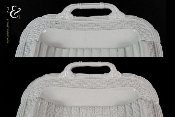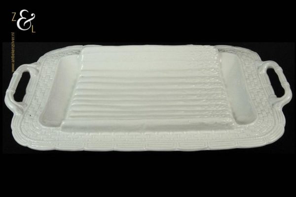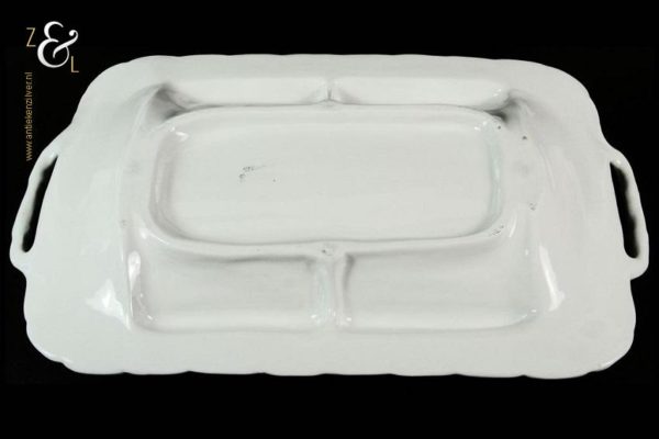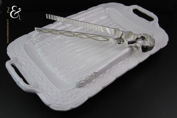 Deze mooie royale porseleinen aspergedienschaal is vermoedelijk gemaakt bij de Koninklijke Sphinx-fabriek te Maastricht in de tweede helft van de 20e eeuw (het merk aan de onderkant van de schaal is moeilijk leesbaar). De afgebeelde aspergetang is te koop onder artikelnummer 10137 bij de rubriek zilver / groot schepwerk / Aspergetangen en Scheppen.