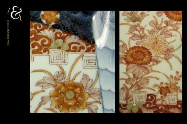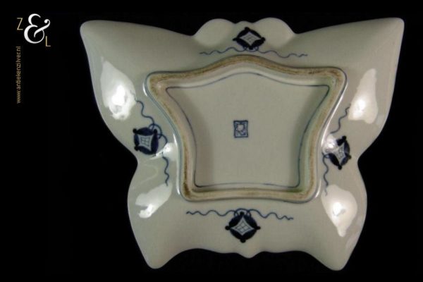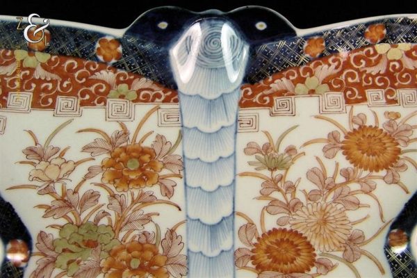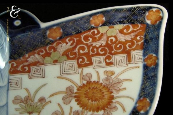 Dit bord in de vorm van een vlinder is gemaakt in Japan en stamt uit het eind van de 19e begin 20e eeuw, de zogenaamde Meiji periode die liep van 1868 tot 1912. Het wit, blauw en rood geglazuurde porseleinen vlindervormige Imari bord is opgehoogd met goud en gedecoreerd met bloemen / pioenrozen. Het bord is aan de achterzijde langs de rand in het blauw gedecoreerd met vier heilbrengende symbolen en heeft in het midden een onbekende familienaam. Het bord weegt 655 gram en is 25 cm lang bij 20 cm breed.