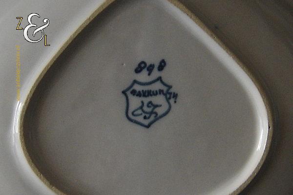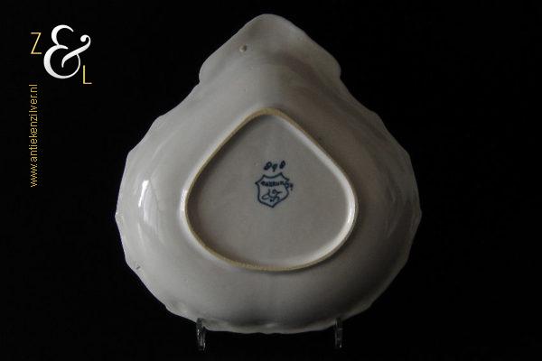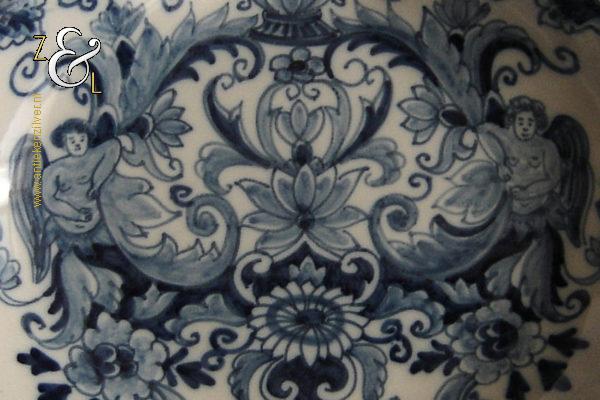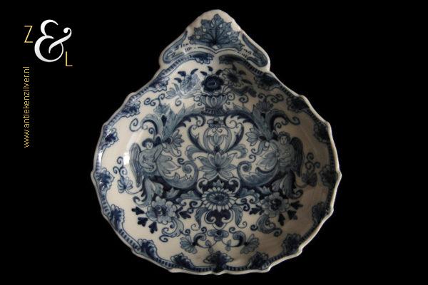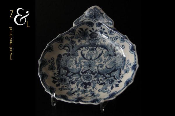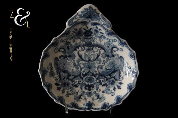 Deze schaal / schotel is in de eerste helft van de 20e eeuw gemaakt in Makkum Friesland bij de Koninklijke Tichelaar. De op de hand beschilderde schaal / schotel is voorzien van een symmetrisch kobaltblauw-wit decor met engeltjes / cherubijntjes en bloem- bladmotieven. De aardewerk schaal / schotel heeft aan de onderzijde drie proenmerken* deze ontstaan door het gebruik van proenen bij het stapelen van de schotels / borden in de oven. Tevens heeft de schaal / schotel aan de onderzijde het blauwe merk van de Koninklijke Tichelaar “Makkum in een schild” het modelnummer 898 en het signatuur JH van de schilder. De schaal / schotel is 22.1 cm lang bij 21 cm breed bij 4.8 cm diep en weegt 319 gram. De schaal / schotel wordt verkocht exclusief bordenstandaard.