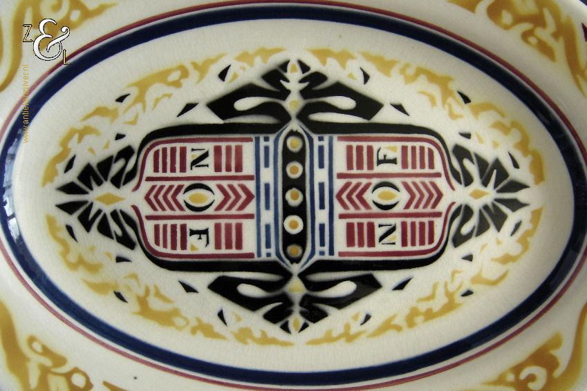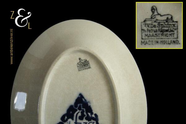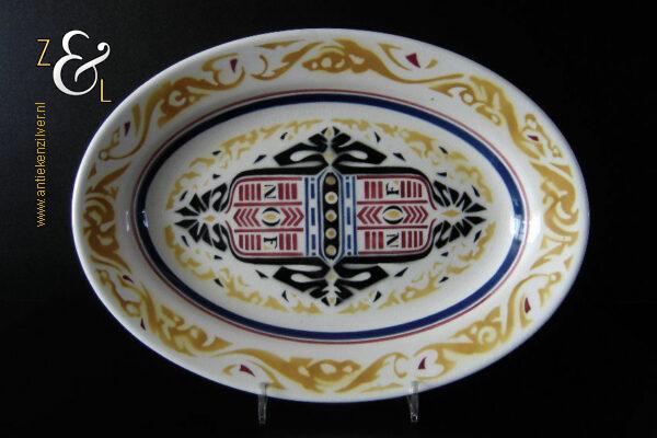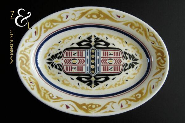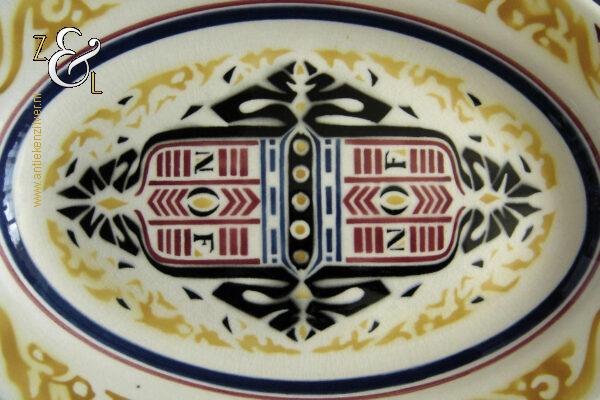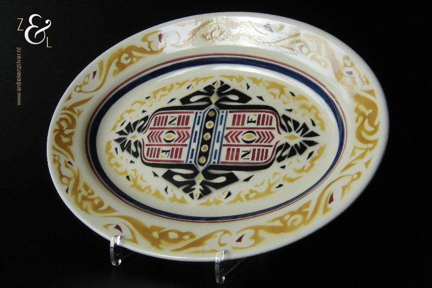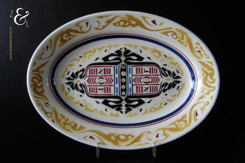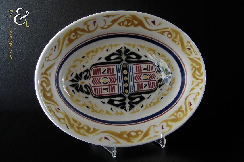 Deze schaal / schotel is gemaakt door aardewerkfabriek De Sphinx Petrus Regout* in Maastricht. De schaal / schotel is in 1924 ontworpen door Richard Roland Holst in de Amsterdamse School stijl (Art Deco) ter gelegenheid van het 40-jarig bestaan van de Nederlandsche Oliefabrieken (NOF) Calvé te Delft (1884-1924). Aan de onderzijde van de schaal / schotel staat het merk: N.V. De Sphinx Petrus Regout & Co. Maastricht Made in Holland dat vanaf 1883 in gebruik was en de tekst: Aangeboden door Oliefabrieken Calvé Delft. De schaal / schotel die 32 cm lang bij 23 cm breed bij 4 cm diep is heeft aan de bovenzijde een geometrisch gestileerd decor in de kleuren geel, rood en blauw met de tekst: NOF. De schaal / schotel heeft een egale craquelé en aan één lange zijde twee kleine plekjes in het glazuur (zie geel omkaderde gedeeltes op afbeelding) dit is de afdruk van een staander die gebruikt werd bij het stapelen van de geglazuurde schalen / schotels tijdens het bakken in de oven. De schaal / schotel wordt verkocht exclusief bordenstandaard.