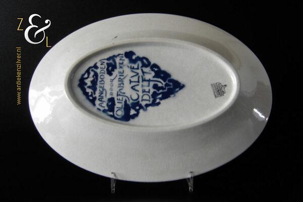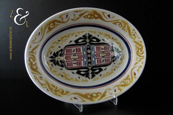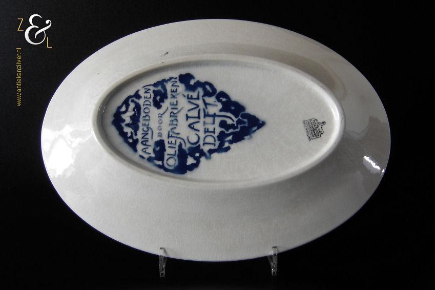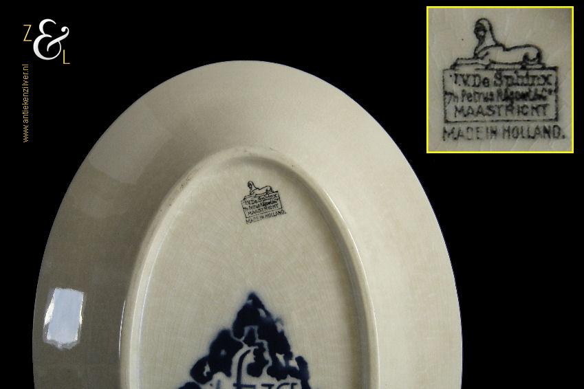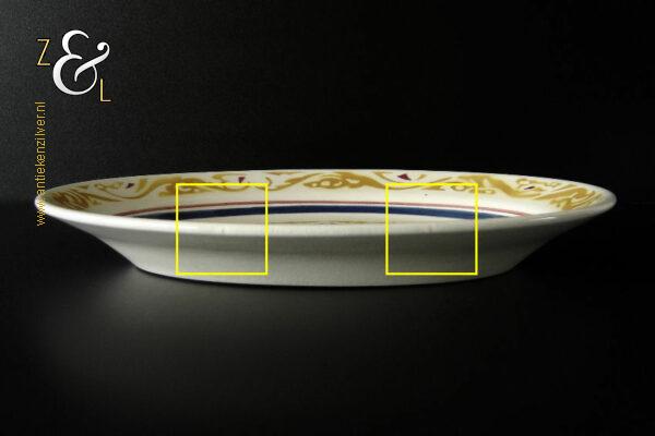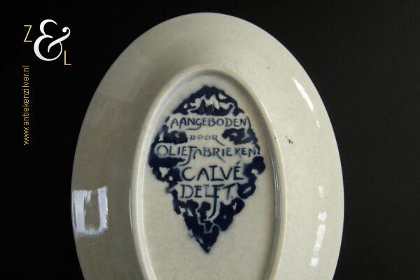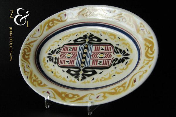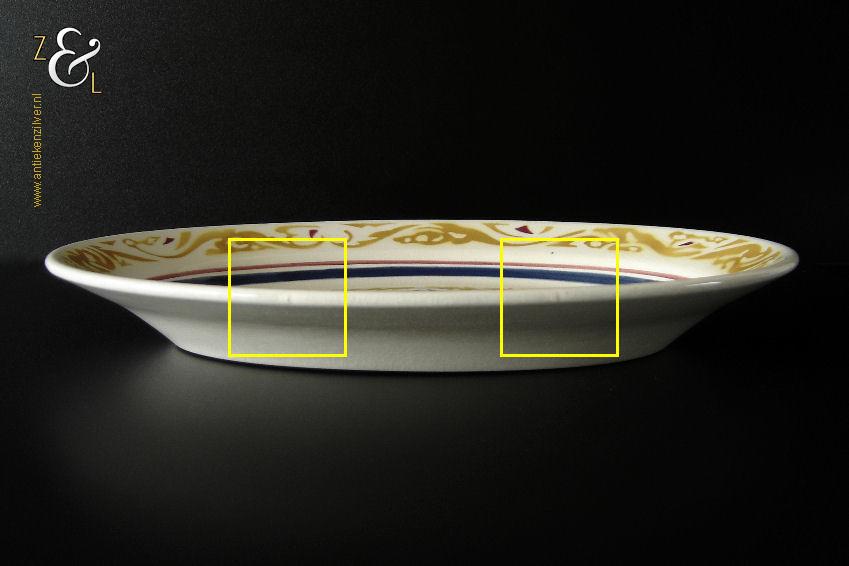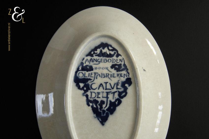 Deze schaal / schotel is gemaakt door aardewerkfabriek De Sphinx Petrus Regout* in Maastricht. De schaal / schotel is in 1924 ontworpen door Richard Roland Holst in de Amsterdamse School stijl (Art Deco) ter gelegenheid van het 40-jarig bestaan van de Nederlandsche Oliefabrieken (NOF) Calvé te Delft (1884-1924). Aan de onderzijde van de schaal / schotel staat het merk: N.V. De Sphinx Petrus Regout & Co. Maastricht Made in Holland dat vanaf 1883 in gebruik was en de tekst: Aangeboden door Oliefabrieken Calvé Delft. De schaal / schotel die 32 cm lang bij 23 cm breed bij 4 cm diep is heeft aan de bovenzijde een geometrisch gestileerd decor in de kleuren geel, rood en blauw met de tekst: NOF. De schaal / schotel heeft een egale craquelé en aan één lange zijde twee kleine plekjes in het glazuur (zie geel omkaderde gedeeltes op afbeelding) dit is de afdruk van een staander die gebruikt werd bij het stapelen van de geglazuurde schalen / schotels tijdens het bakken in de oven. De schaal / schotel wordt verkocht exclusief bordenstandaard.