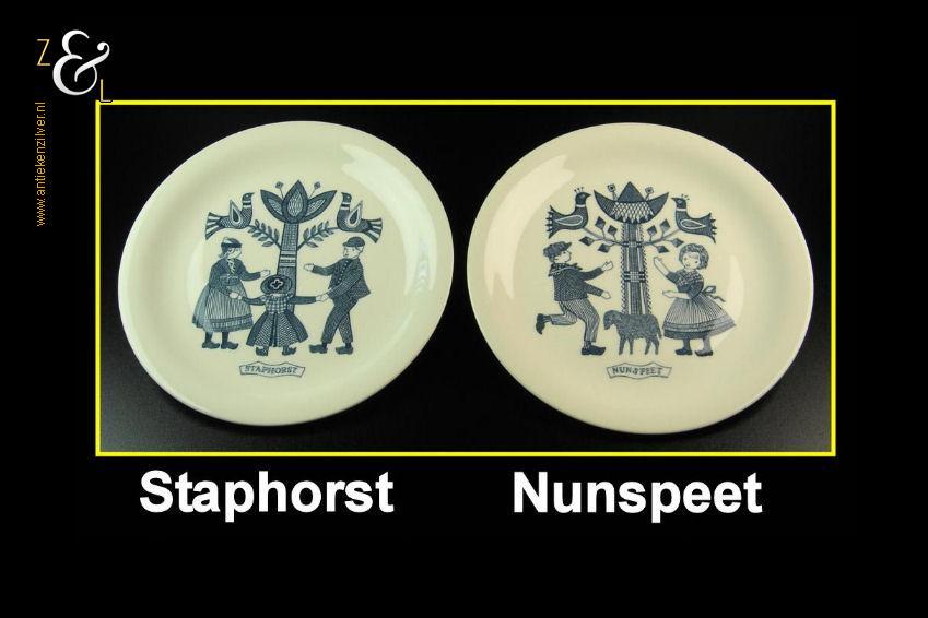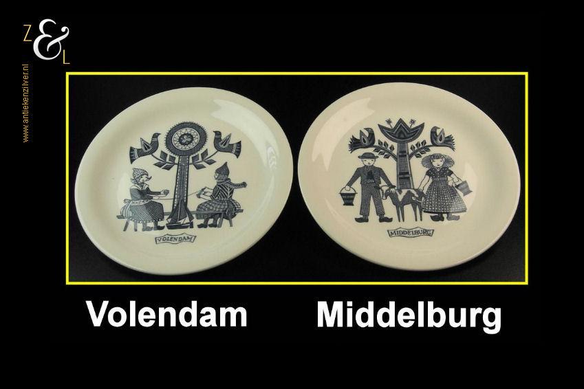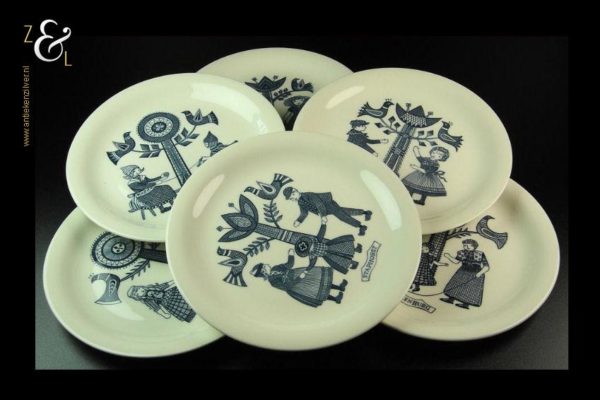 Deze zes porseleinen ontbijt- boterhambordjes zijn in de zestiger jaren bij P. Regout / Royal Sphinx in Maastricht Holland gemaakt voor Leeuwenzegel (een margarineproduct) waar je er met zegeltjes voor kon sparen. De ontbijt- boterhambordjes wegen samen 1816 gram en hebben een diameter van 20.3 cm. Deze complete set van zes bordjes hebben de afbeeldingen van kinderklederdrachten uit Staphorst, Nunspeet, Marken, Spakenburg, Volendam en Middelburg.