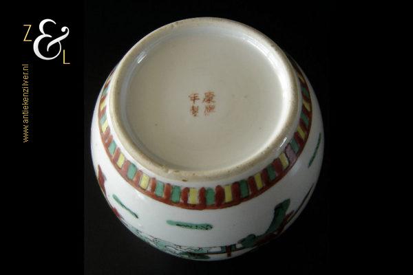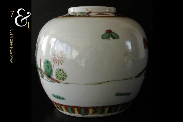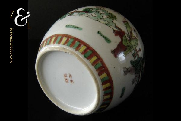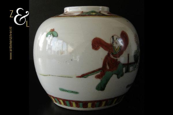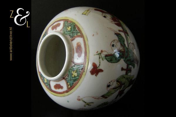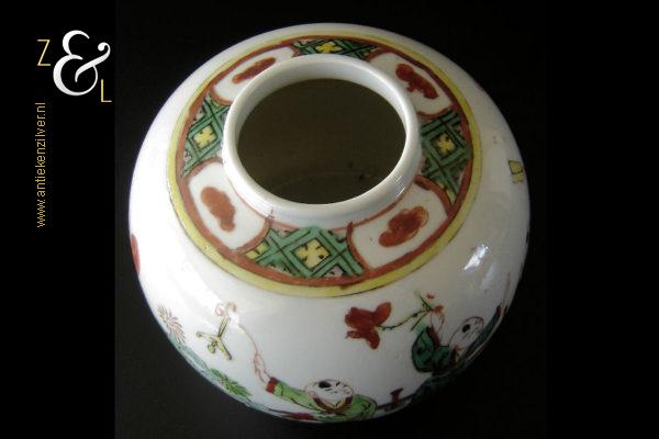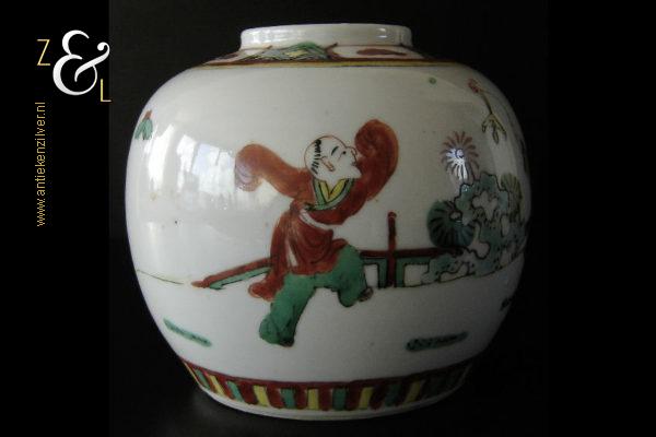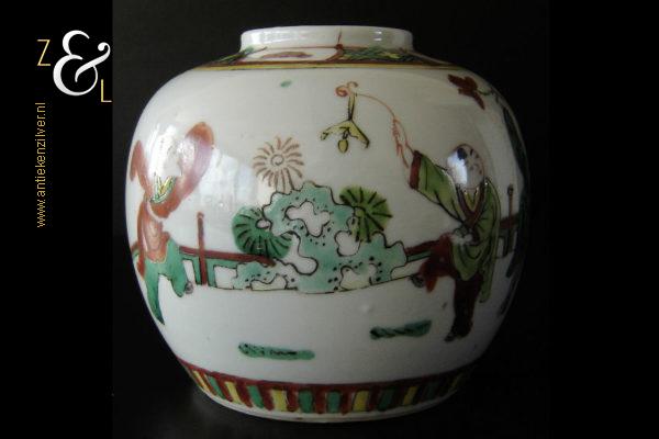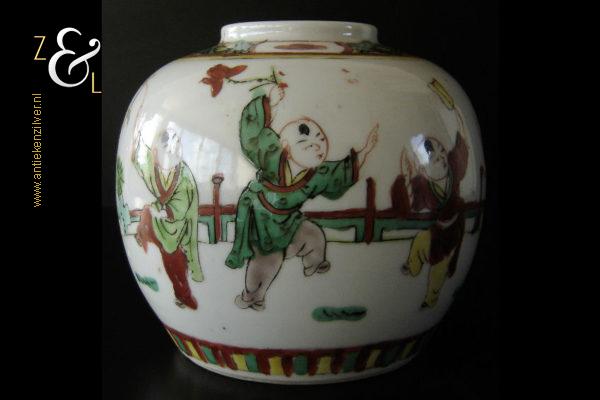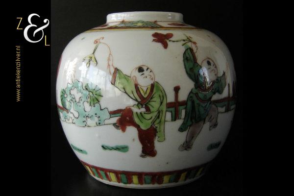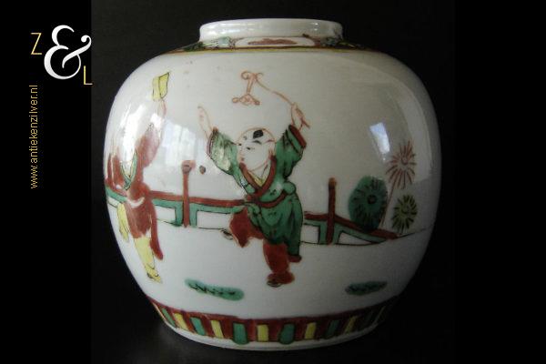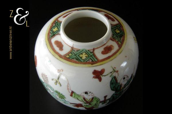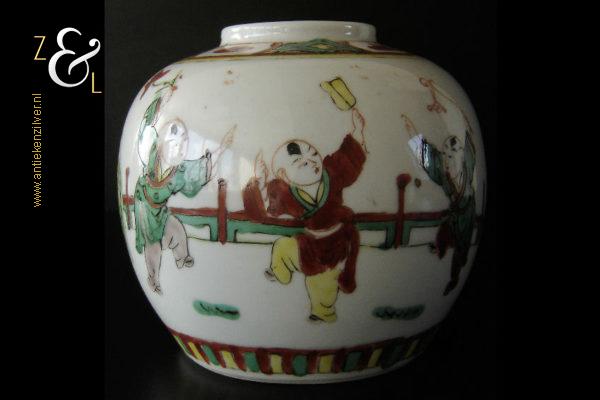 Deze porseleinen gemberpot is vervaardigd in China aan het begin van de 20e eeuw. De in famille verte* beschilderde gemberpot heeft een decor van dansende, spelende en vliegerende kinderen (zotjes*). Buiten de groene (famille verte) kleur is de gemberpot beschilderd in de kleuren rood, geel en zwart. Aan de onderzijde is de gemberpot gemerkt met vier karakters in ijzerrood. De gemberpot heeft gebruikssporen (kleine beschadigingen aan de rand van de onderzijde).
