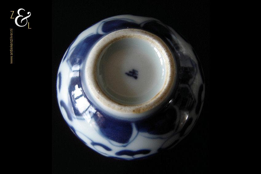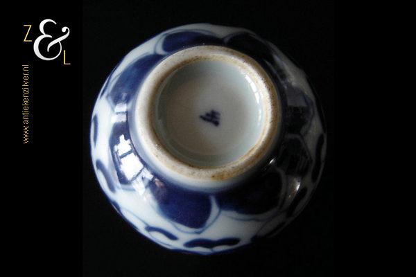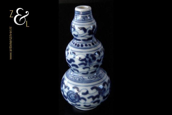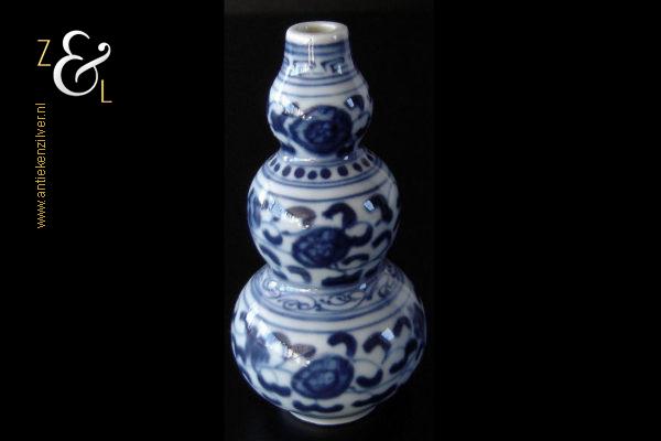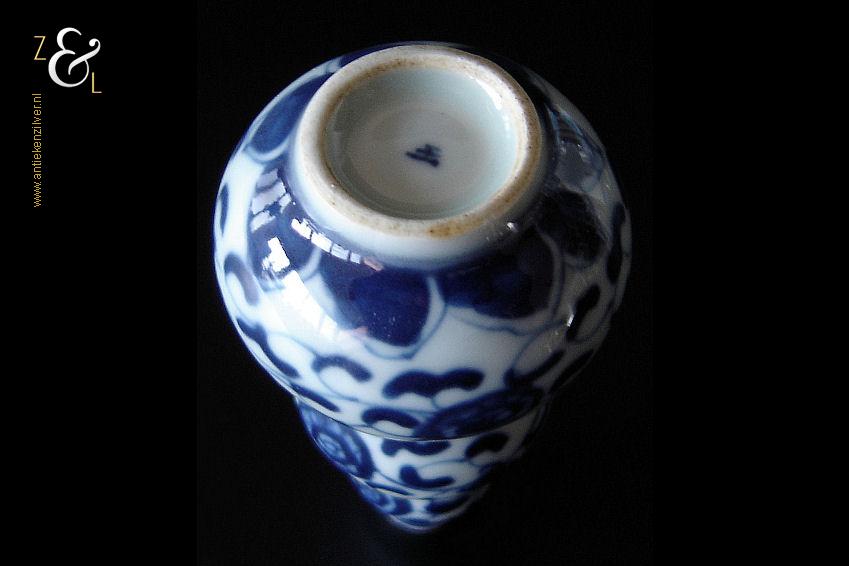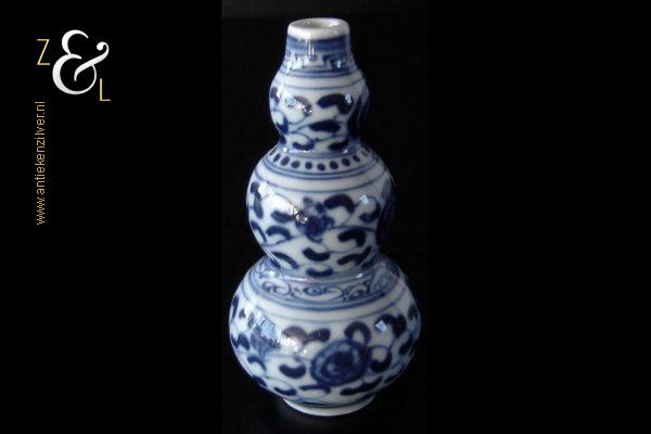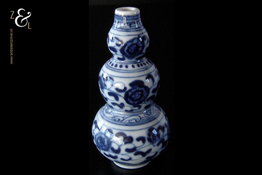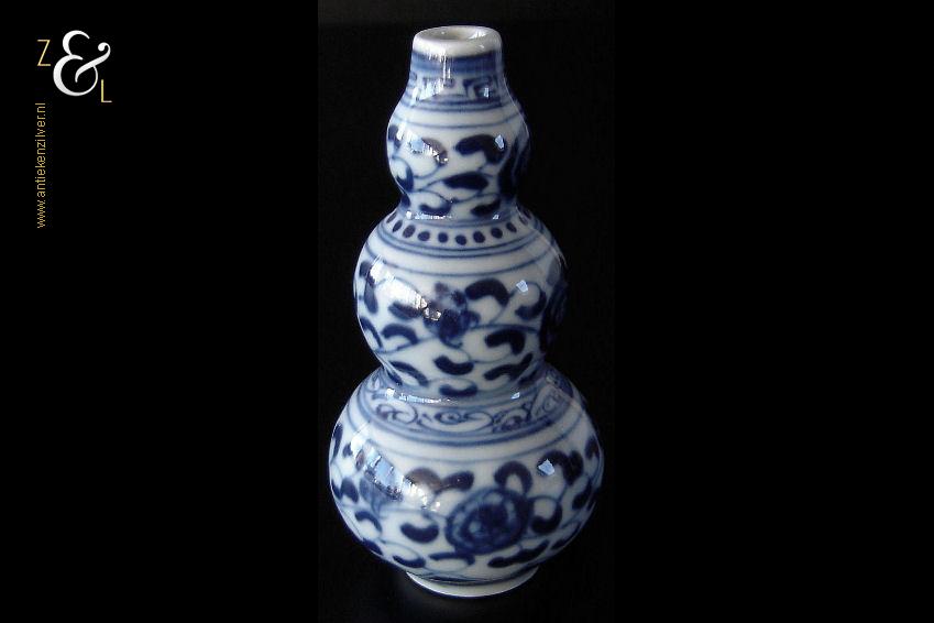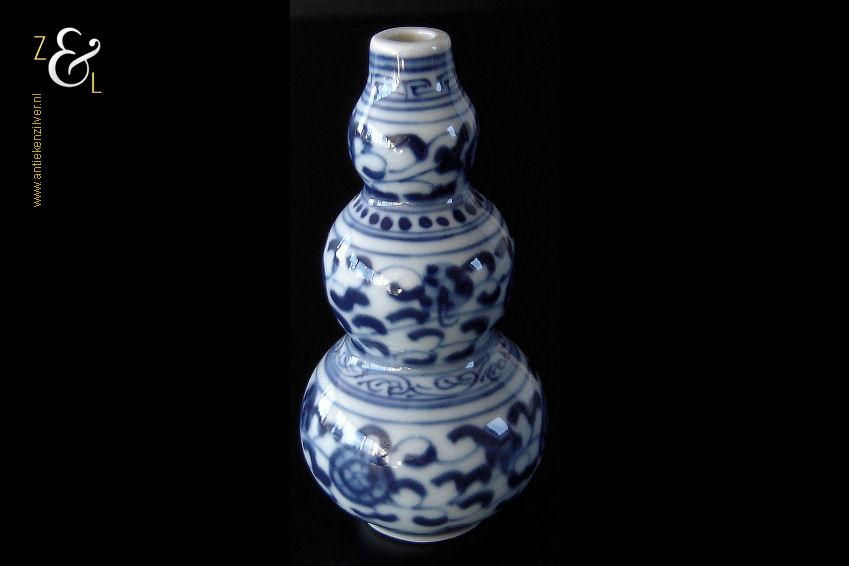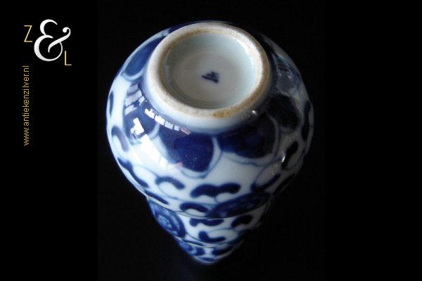 Dit blauw-witte porseleinen miniatuur knobbelvaasje / knobbelflesje in de vorm van een kalebas is gemaakt in China omstreeks 1900 de Wanyu / Blue de Hue periode. Het knobbelvaasje / knobbelflesje is op de hand beschilderd met bloem- en bladmotieven. Aan de onderzijde is het knobbelvaasje / knobbelflesje gemerkt met het enkelvoudig karaktermerk Yu. Het miniatuur knobbelvaasje / knobbelflesje weegt 72 gram, is 8.9 cm hoog en heeft een diameter van 4.4 cm.