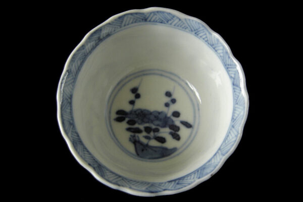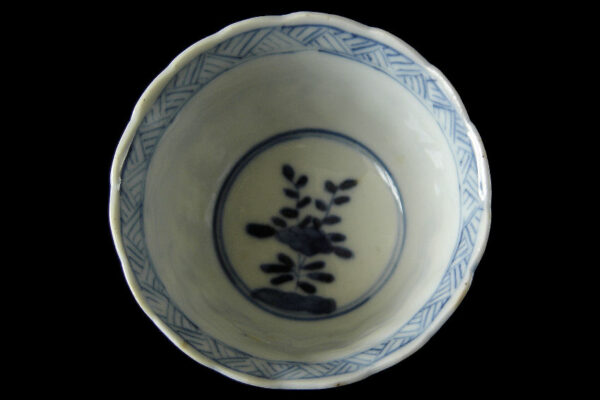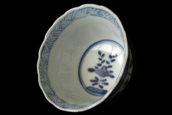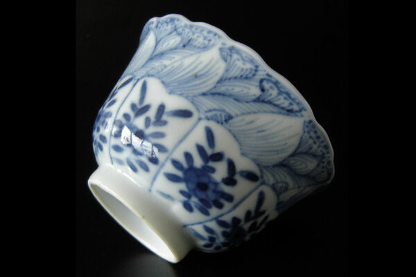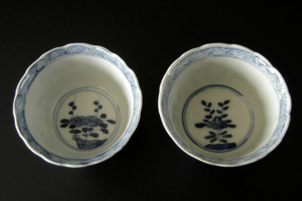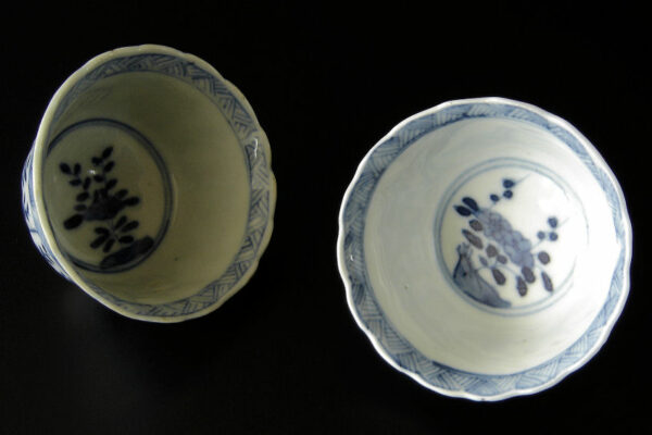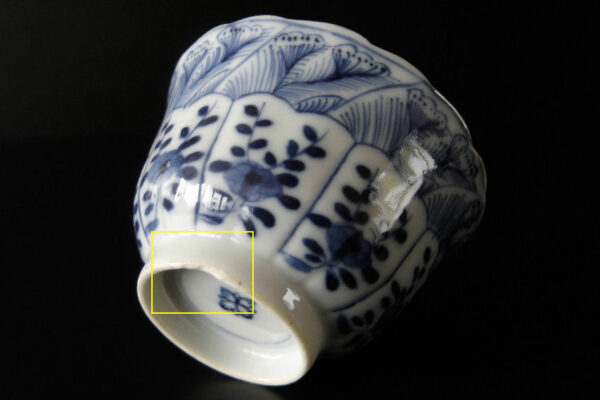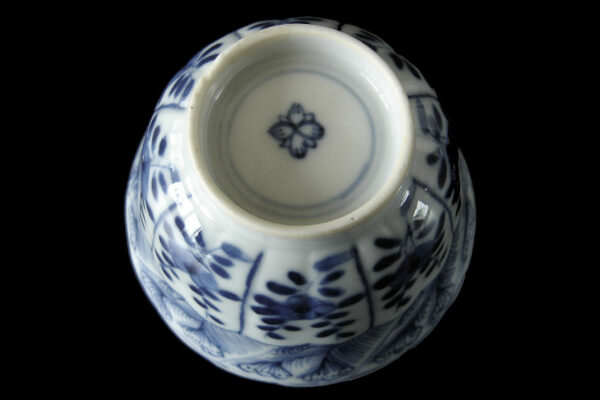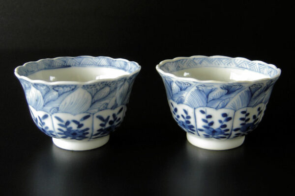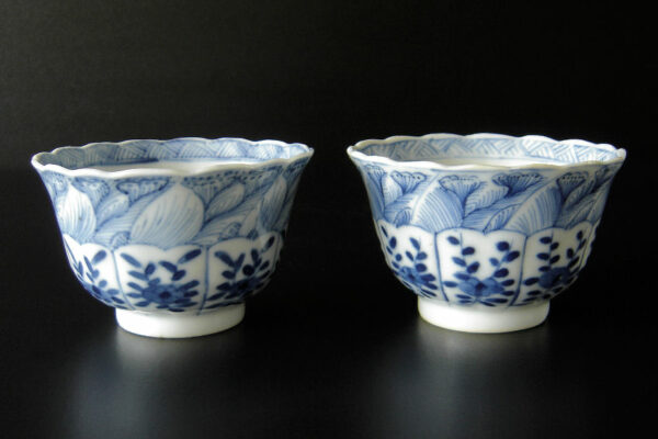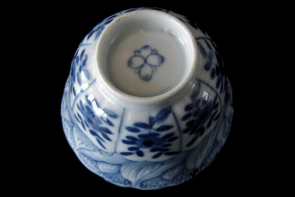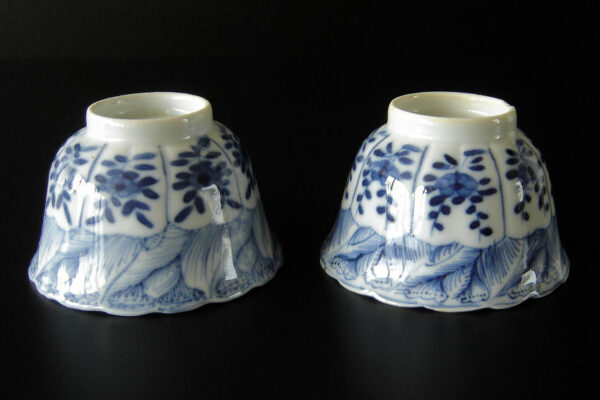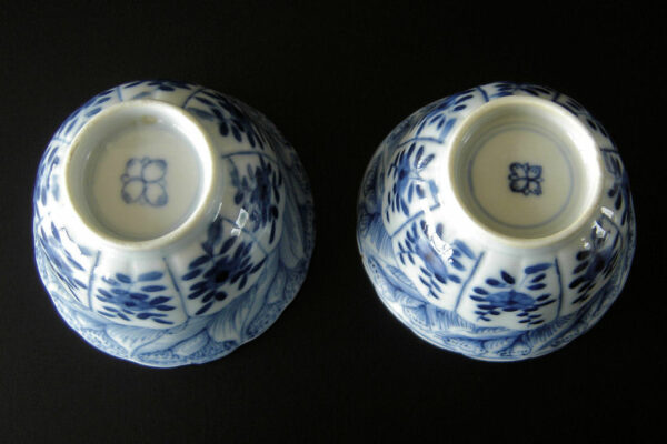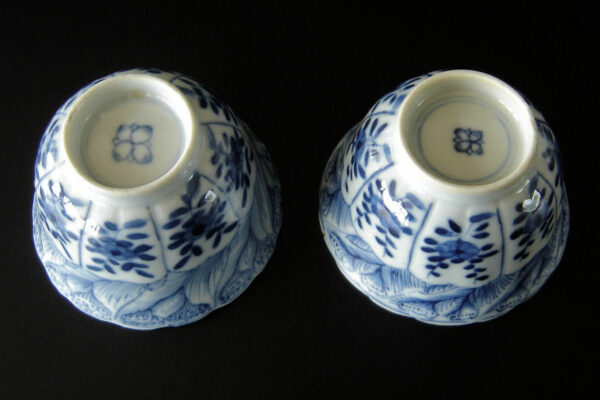 Dit stel porseleinen theekopjes is in de 18e eeuw gemaakt in China. De geschulpte blauw witte theekopjes zijn op de hand beschilderd en gedecoreerd met een gestileerd blader- en bloemmotief. Het stel theekopjes is aan de onderzijde in onderglazuurblauw gemerkt met het symboolmerk: Bloem* in een dubbele cirkel. De theekopjes wegen 157 gram hebben een diameter van 8.1 cm en zijn 5.1 cm hoog. Het stel theekopjes heeft kleine imperfecties in de glazuur wat inherent is aan Chinees porselein uit de 18e eeuw (zie afbeeldingen), waarbij één van de theekopjes aan de rand van de voet een kleine beschadiging / bakfout* heeft (zie geel omkaderd gedeelte op afbeelding).