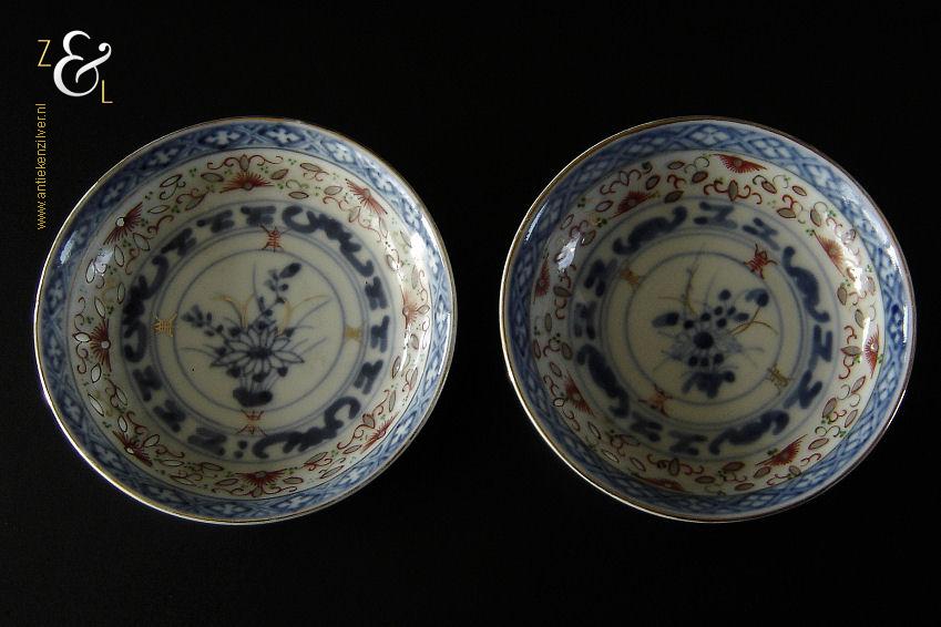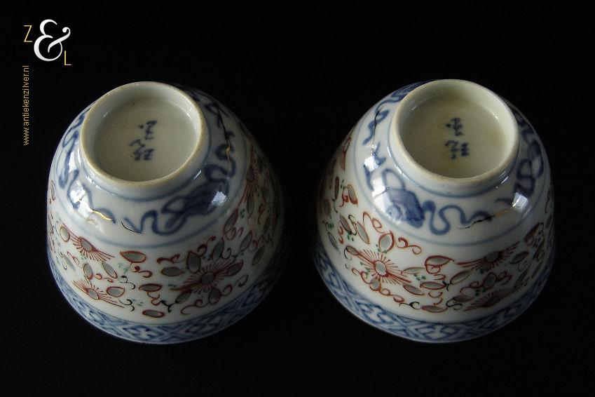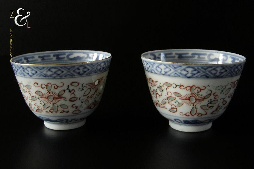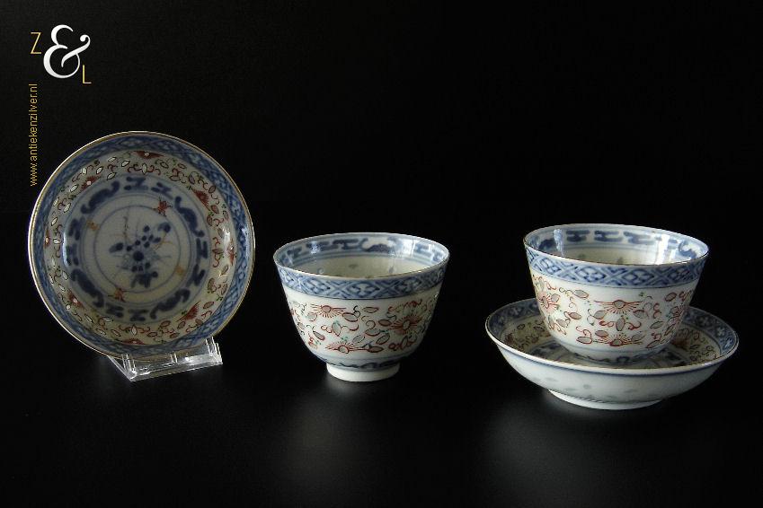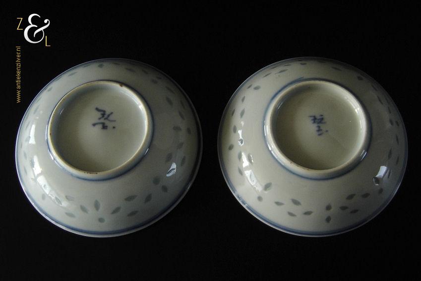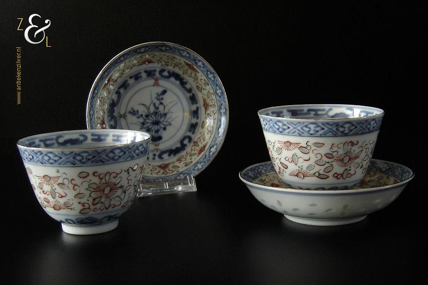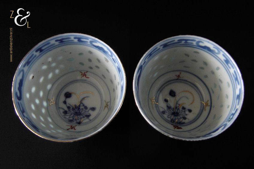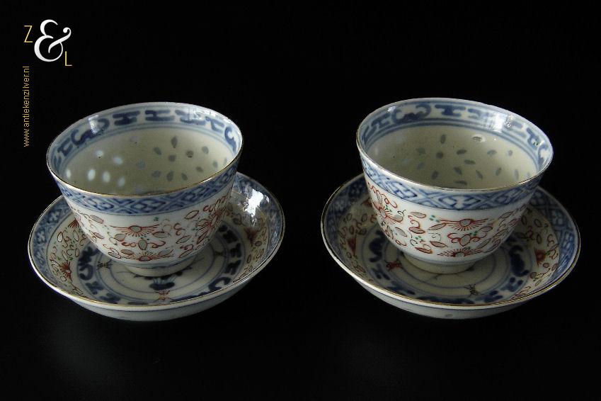Dit stel porseleinen theekopjes en schotels met doorschijnend rijst-ajour / rijstkorrel / rijstoog motief stamt uit de tweede helft van de 20e eeuw de Wanyu periode 1920-1970 en is gemaakt in China. Het stel theekopjes en schotels is op de hand beschilderd in de typische kleuren van Wanyu: blauw, ijzerrood en goud en gedecoreerd met blauwe randen en bloemen. Tevens zijn de kopjes aan de onderzijde gedecoreerd met drie gelukssymbolen. De theekopjes hebben een diameter van 7.1 cm en zijn 5 cm hoog. De schotels hebben een diameter van 9.8 cm en zijn 2.4 cm hoog. De kopjes en schotels wegen samen 246 gram. Het stel theekopjes en schotels is aan de onderzijde gemerkt met met de Chinese karakters voor Wanyu. Het stel theekopjes en schotels heeft héél lichte slijtagesporen.