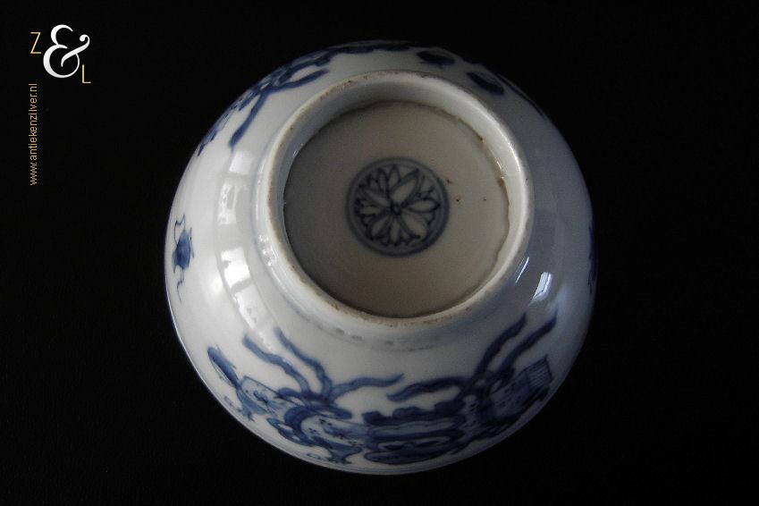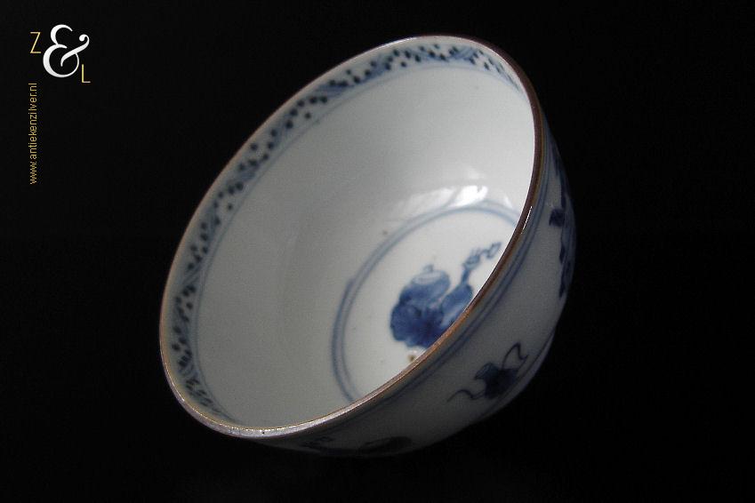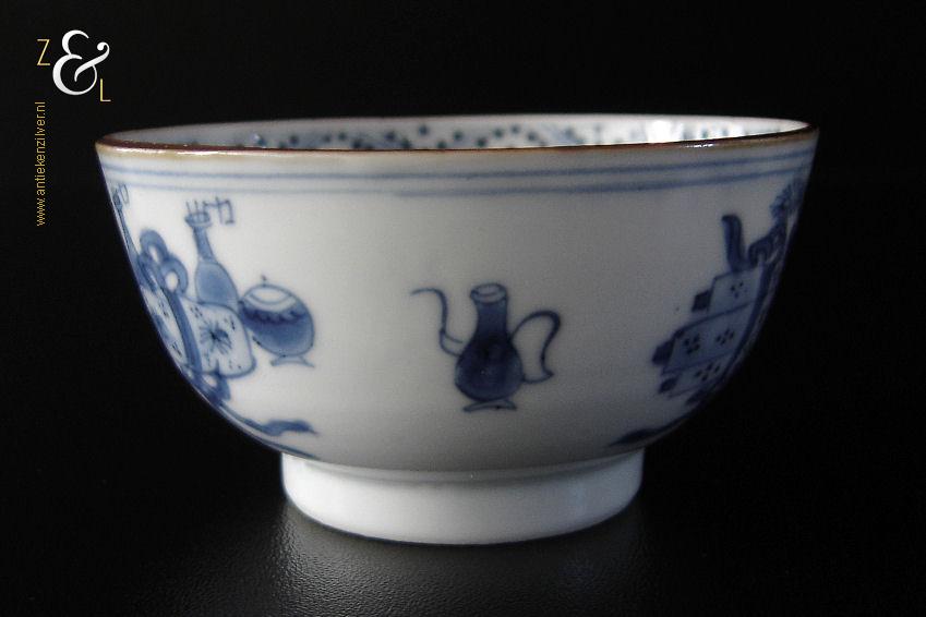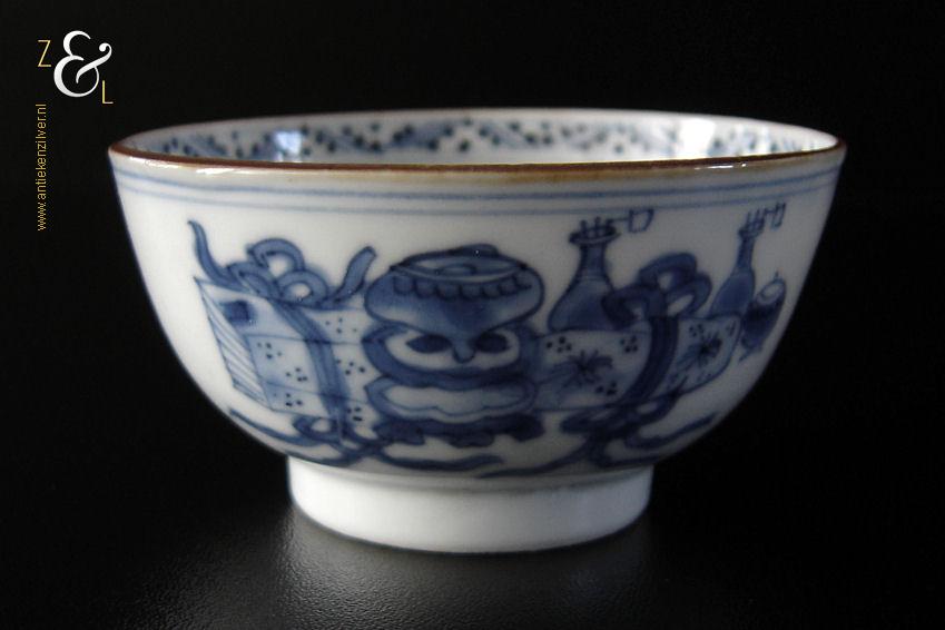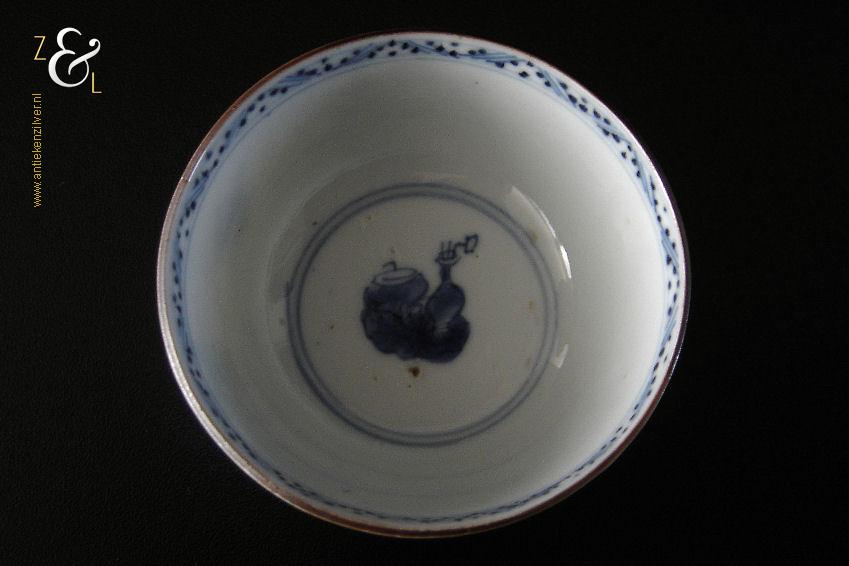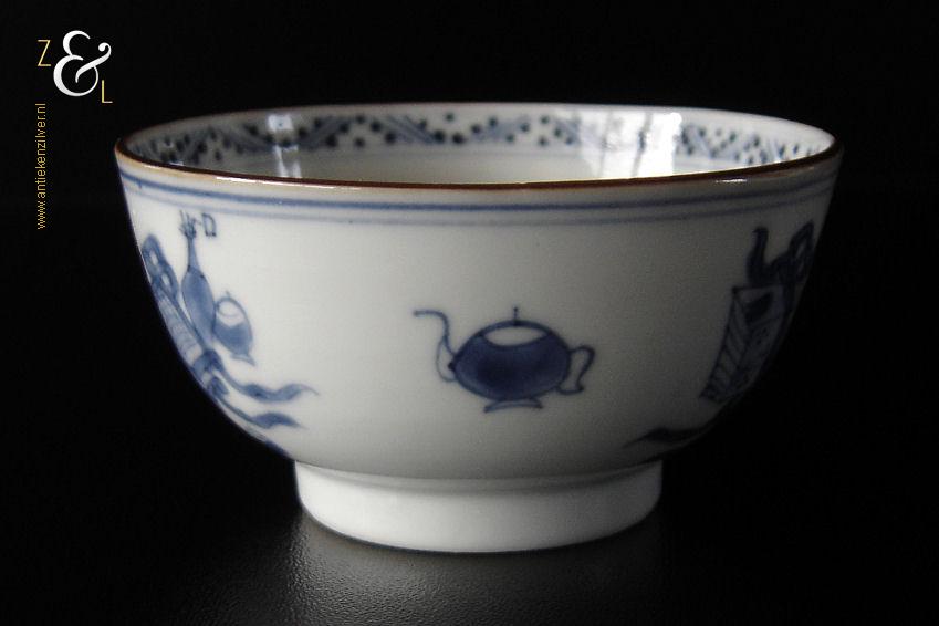 Dit porseleinen theekopje is in de 18e eeuw gemaakt in China de Kangxi periode die van 1661 tot 1722 liep. Het blauw witte theekopje heeft aan de bovenkant een rand in onderglazuurbruin (“jia mangkou”) en is op de hand beschilderd en gedecoreerd in onderglazuurblauw met een Chinese leeuw of hond, een vaas met een pauwenveer (symbool van geluk), een wierookbrander en voorwerpen die te maken hebben met het theeritueel. Het theekopje is aan de onderzijde in onderglazuurblauw gemerkt met het symboolmerk: Bloem* in een dubbele cirkel. Het theekopje heeft een diameter van 7.3 cm is 3.7 cm hoog en weegt 49 gram.