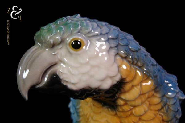 Dit beeld / plastiek van een papegaai / blauwgele Ara is gemaakt door de Goebel Porseleinfabriek in Oeslau Rödental West-Duitsland. De porseleinen papegaai / blauwgele Ara draagt aan de onderzijde in reliëf het modelnummer CV 79, het jaartal 1967 het jaar waarin de papegaai geproduceerd werd en het handelsmerk TM4 dat tussen 1964 en 1972 in gebruik was. De papegaai / blauwgele Ara weegt 741 gram en is 21 cm hoog.