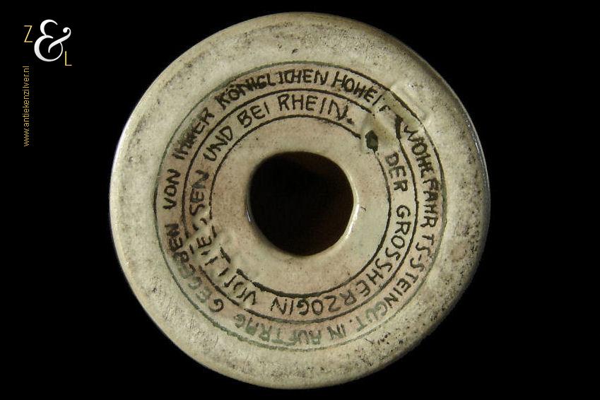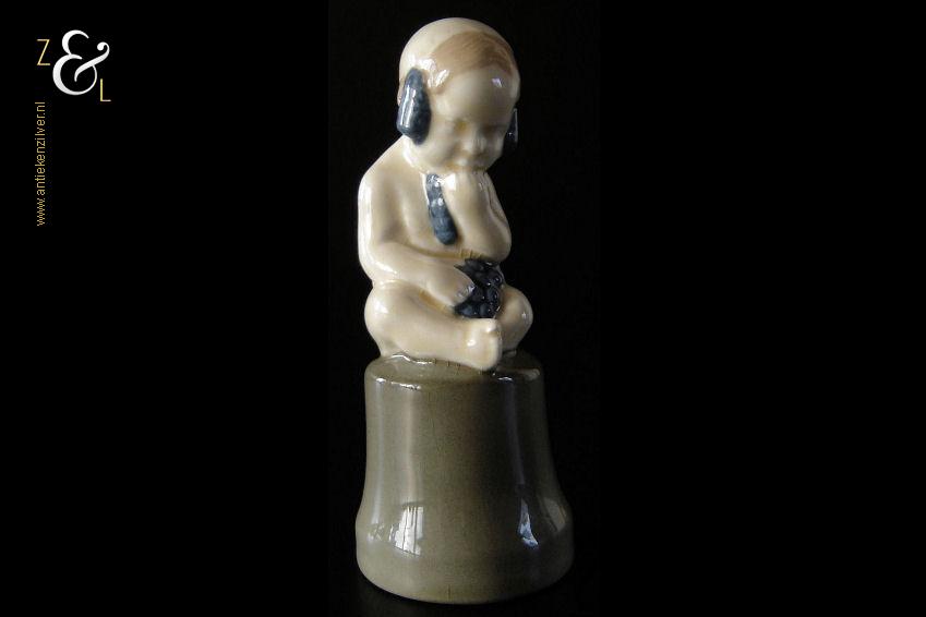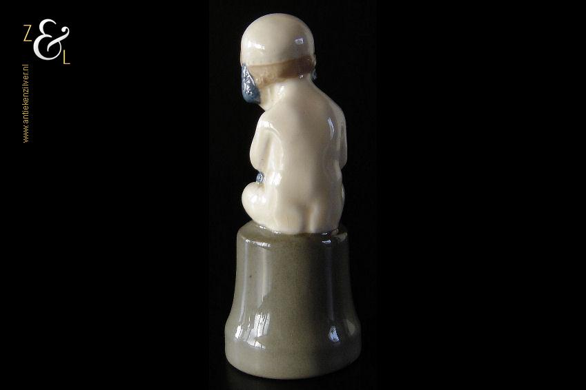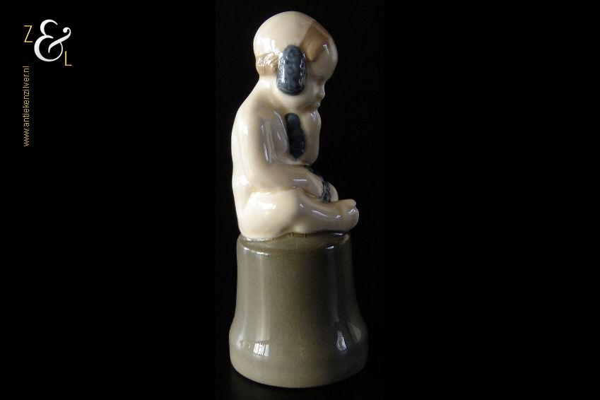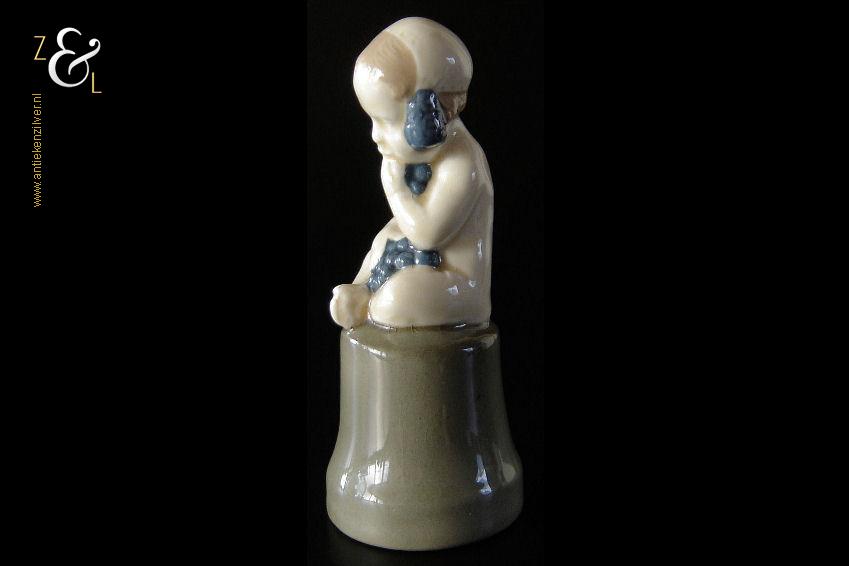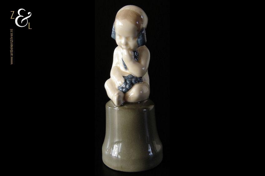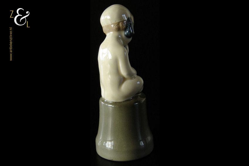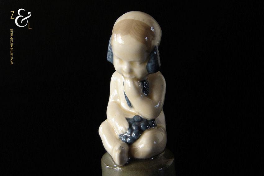 Dit beeld / plastiek van een putto met druiven zittend op een klokvormige sokkel naar een ontwerp en model uit 1910 van Ernst Riegel is gemaakt bij de Wächtersbacher Steingutfabrik in Duitsland. De onderkant van het beeld / plastiek is gemerkt / gestempeld in zwart met de tekst “Wohlfahrtssteingut in auftrag gegeben von ihrer Königlichen Hoheit der Grossherzogin von Hessen und Bei Rhein” (“Welzijns aardewerk in commissie van haar Koninklijke Hoogheid de Groothertogin van Hessen en de Rijn”). Tevens heeft het beeld / plastiek een blindmerk van de Wächtersbacher Steingutfabrik. Het Art Nouveau / Jugendstil aardewerk / keramiek beeld / plastiek dat een onderglazuur schildering in oker en blauw heeft weegt 42 gram is 10.2 cm hoog en heeft een diameter van 4.1 cm. Het beeld / plastiek heeft lichte sporen van craquelure.