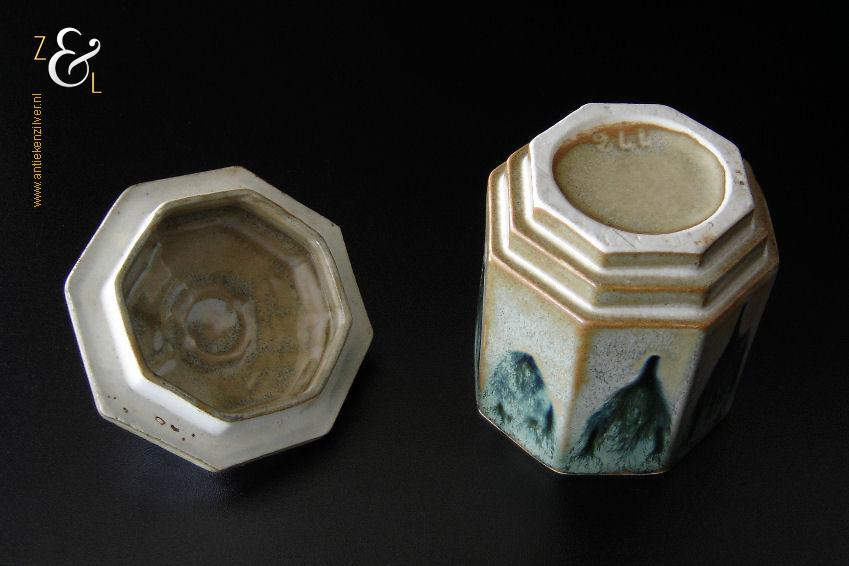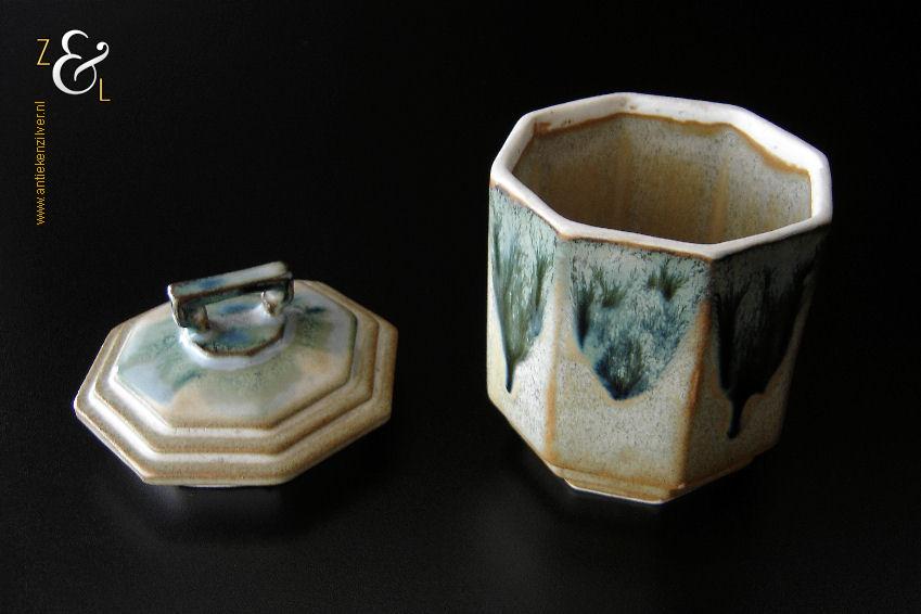 Deze achtkantige in Art Deco stijl gefabriceerde aardewerk suikerpot / snoeppot stamt vermoedelijk uit West Duitsland (zestiger jaren) en heeft aan de onderzijde het modelnummer 244. De blauwbeige geglazuurde suikerpot / snoeppot weegt 398 gram heeft een diameter van 10.2 cm en is 13 cm hoog.