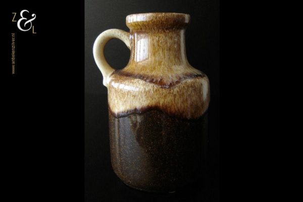 Deze vaas met oor is gemaakt bij de keramiekfabriek Scheurich in de plaats Kleinheubach Duitsland. De aardewerk vaas die uit de zestiger jaren stamt is aan de onderzijde gemerkt met W. Germany en het modelnummer 414-16. De vaas weegt 501 gram is 16 cm hoog en heeft een diameter van 10 cm. De keramiekfabriek Scheurich produceerde dit model in diverse glazuurkleuren, deze vaas is uitgevoerd in een beige bruine blauwe glazuur. Het papieren etiket is verloren gegaan.