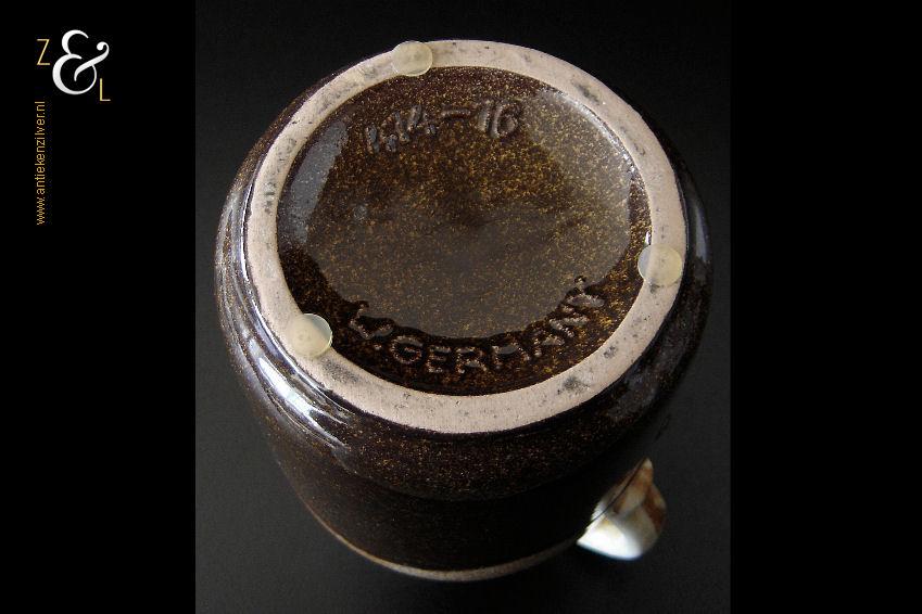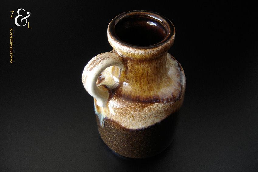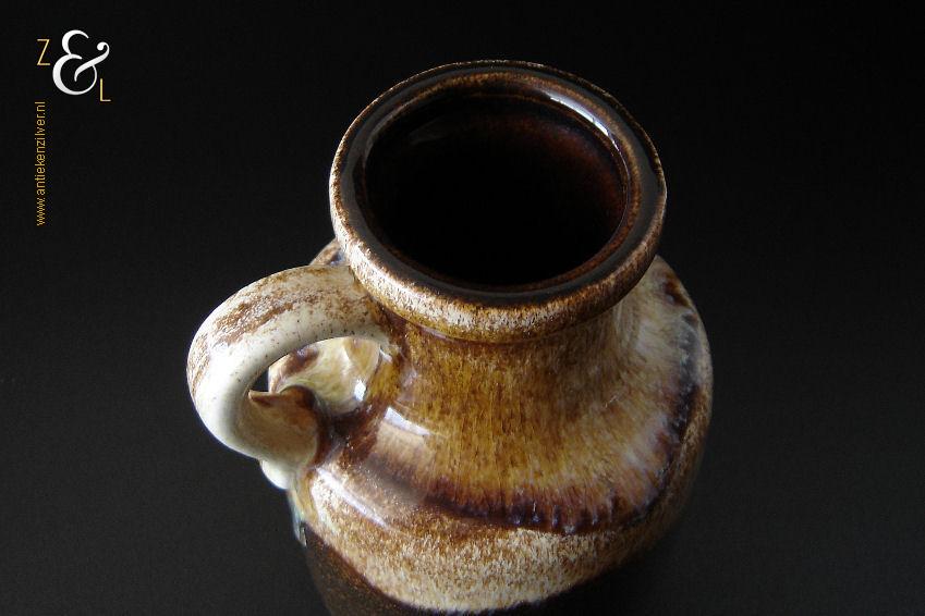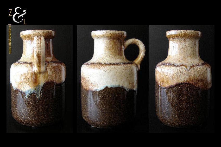 Deze vaas met oor is gemaakt bij de keramiekfabriek Scheurich in de plaats Kleinheubach Duitsland. De aardewerk vaas die uit de zestiger jaren stamt is aan de onderzijde gemerkt met W. Germany en het modelnummer 414-16. De vaas weegt 501 gram is 16 cm hoog en heeft een diameter van 10 cm. De keramiekfabriek Scheurich produceerde dit model in diverse glazuurkleuren, deze vaas is uitgevoerd in een beige bruine blauwe glazuur. Het papieren etiket is verloren gegaan.