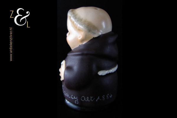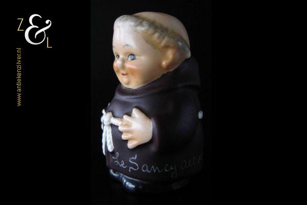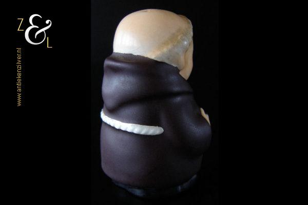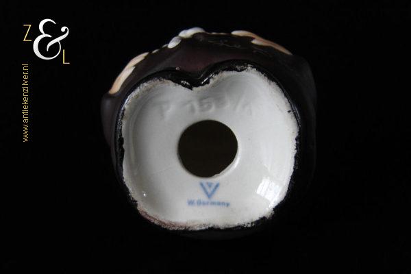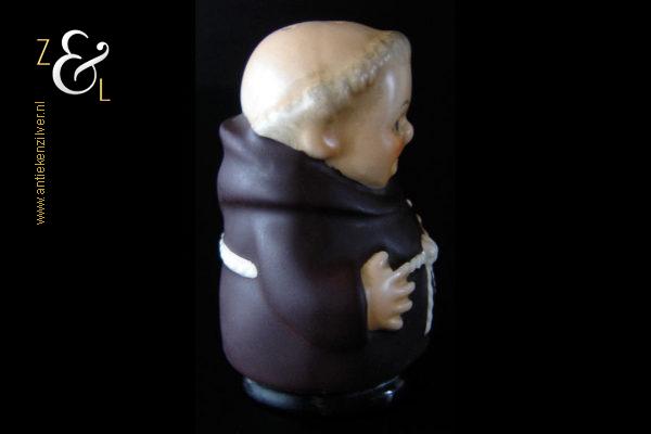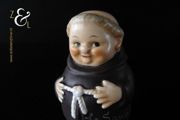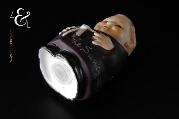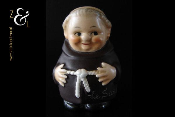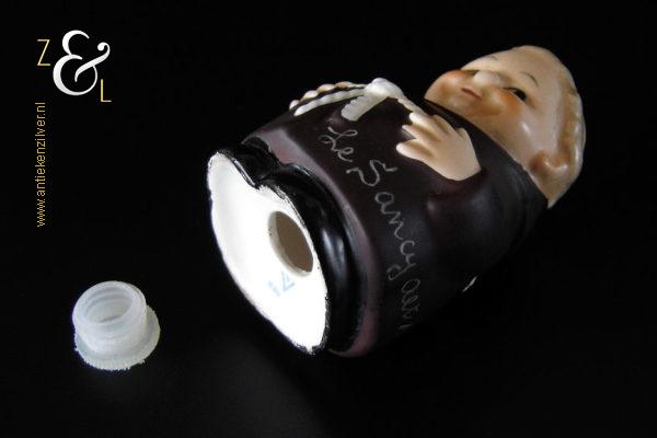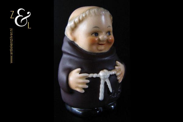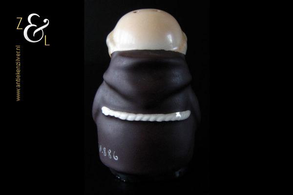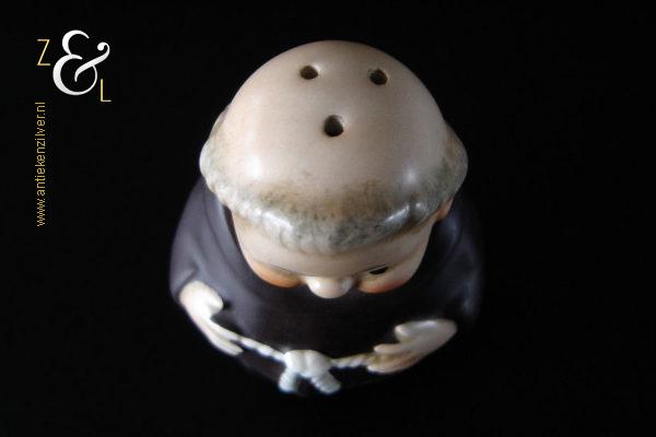 Deze zoutstrooier model monnik / pater is gemaakt door de Goebel Porseleinfabriek in Oeslau Rödental West-Duitsland en stamt uit de vijftiger jaren. De porseleinen zoutstrooier draagt aan de onderzijde in reliëf het modelnummer P 153/1 en het handelsmerk TM2 dat in 1956 (Small Bee) in gebruik was. De zoutstrooier heeft nog zijn originele stopje en weegt 46 gram en is 6.5 cm hoog.