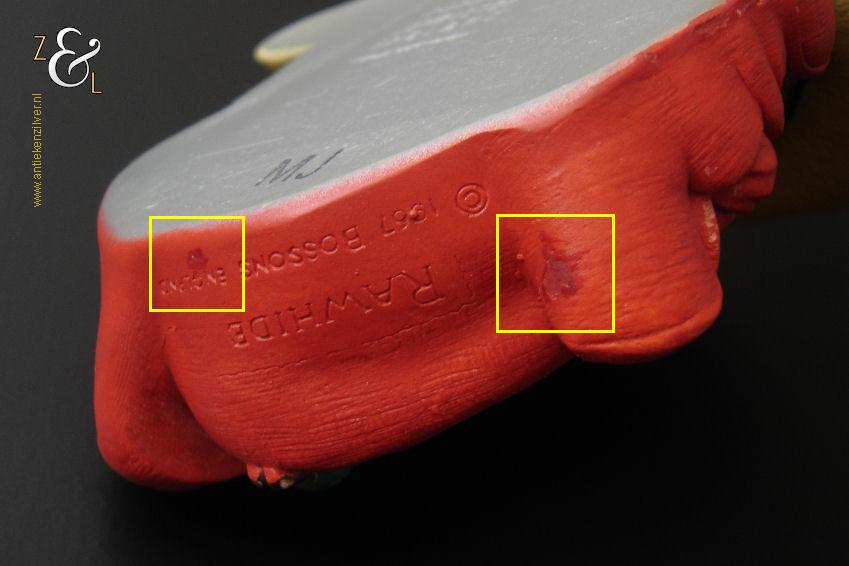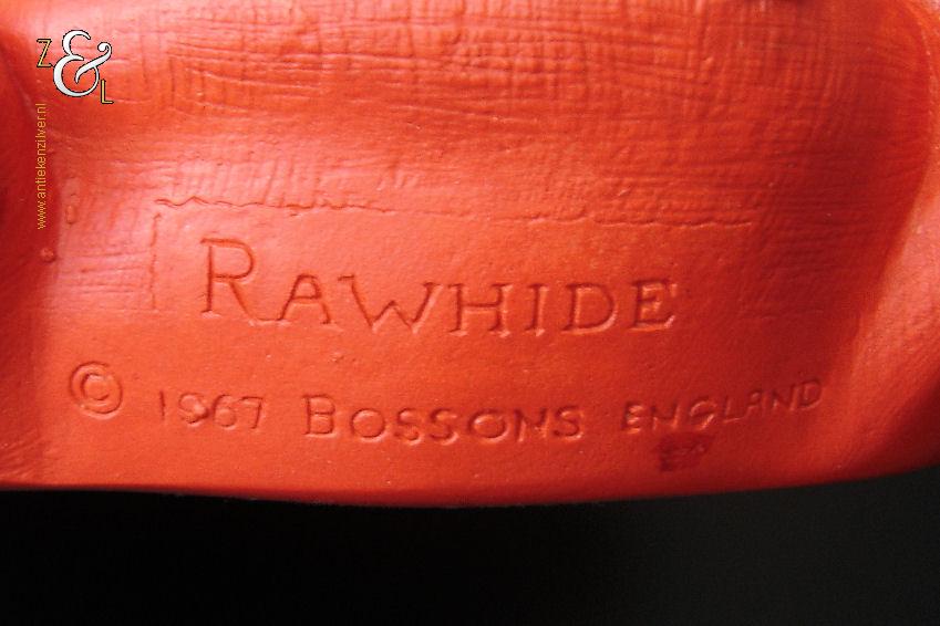 Dit gipsen / Vitreplas beeld / plastiek / wandmasker model Rawhide is gemaakt door de W.H. Bossons Company in Congleton Cheshire Engeland. Het op de hand gegoten polychroom beschilderde wandmasker dat tweemaal met een harde matte lak is afgewerkt is gecreëerd door de kunstenaar / beeldhouwer Fred Wright en was van 1968 tot 1996 in productie. Op de achterzijde staat “Bossons Congleton England World Copyright” en het (schilders)merk “MJ” en aan de onderzijde staat “Rawhide” het “Copyrightteken 1967 Bossons England”. Het wandmasker weegt 591 gram is 16.9 cm hoog bij 15.3 cm breed en heeft aan de onderzijde twee bijgewerkte plekjes (zie geel omkaderde gedeeltes op afbeelding).