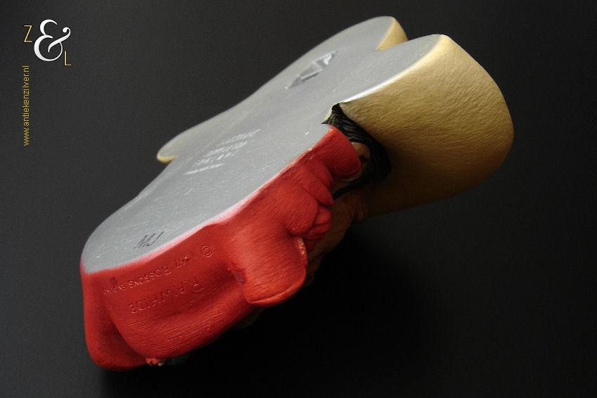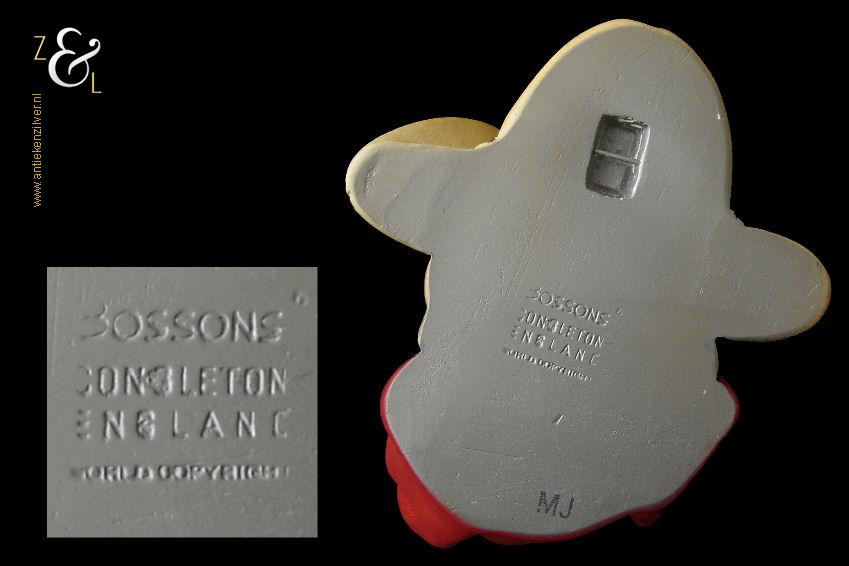 Dit gipsen / Vitreplas beeld / plastiek / wandmasker model Rawhide is gemaakt door de W.H. Bossons Company in Congleton Cheshire Engeland. Het op de hand gegoten polychroom beschilderde wandmasker dat tweemaal met een harde matte lak is afgewerkt is gecreëerd door de kunstenaar / beeldhouwer Fred Wright en was van 1968 tot 1996 in productie. Op de achterzijde staat “Bossons Congleton England World Copyright” en het (schilders)merk “MJ” en aan de onderzijde staat “Rawhide” het “Copyrightteken 1967 Bossons England”. Het wandmasker weegt 591 gram is 16.9 cm hoog bij 15.3 cm breed en heeft aan de onderzijde twee bijgewerkte plekjes (zie geel omkaderde gedeeltes op afbeelding).
