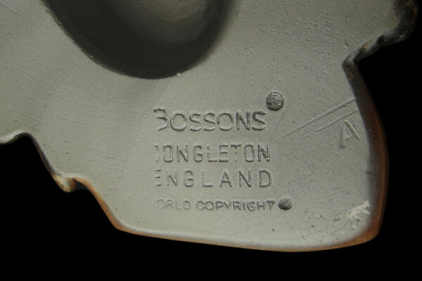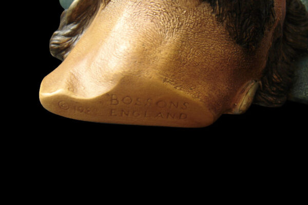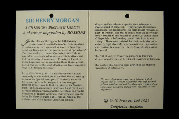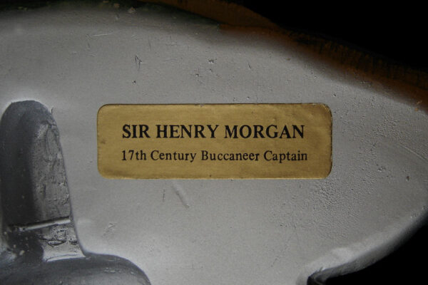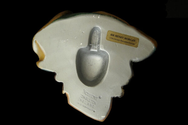 Dit gipsen / Vitreplas beeld / plastiek / wandmasker model Sir Henry Morgan is gemaakt door de W.H. Bossons Company in Congleton Cheshire Engeland. Het op de hand gegoten polychroom beschilderde wandmasker dat tweemaal met een harde matte lak is afgewerkt is gecreëerd door de kunstenaar / beeldhouwer Alice Brindley en was van 1985 tot 1996 in productie. Op de achterzijde staat “Bossons Congleton England World Copyright” en is het etiket geplakt met “Sir Henry Morgan 17th Century Buccaneer Captain”. Aan de onderzijde staat het “Copyrightteken 1982 met daarnaast Bossons England”. Tevens heeft het wandmasker het originele label “Sir Henry Morgan”. Het wandmasker weegt 950 gram is 18 cm hoog bij 19.4 cm breed en heeft aan de achterzijde héél lichte gebruikssporen (slijtplekjes van het ophangen).