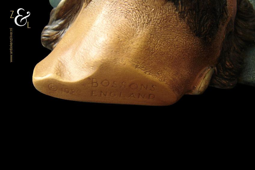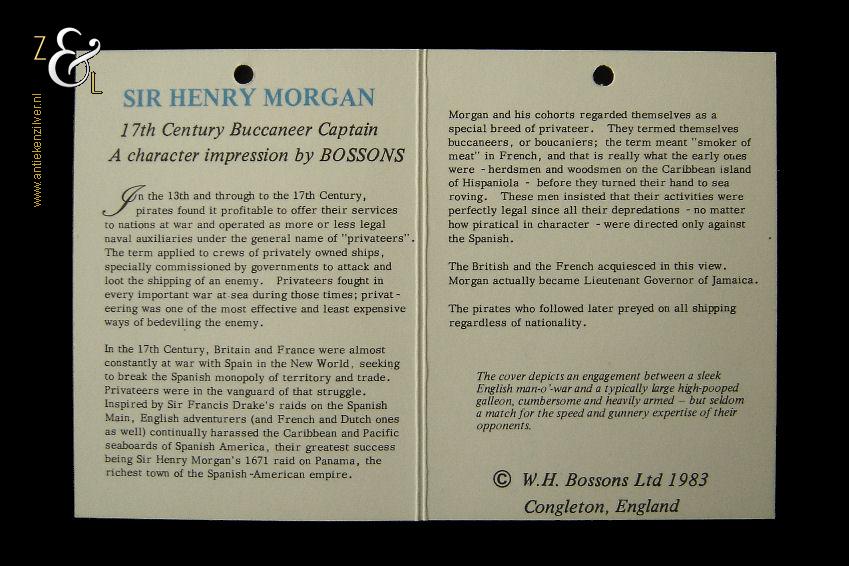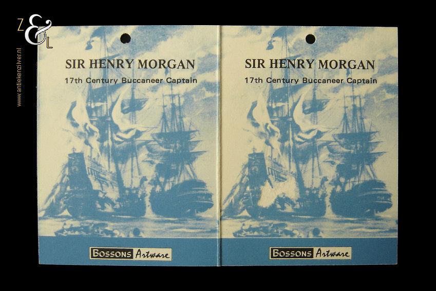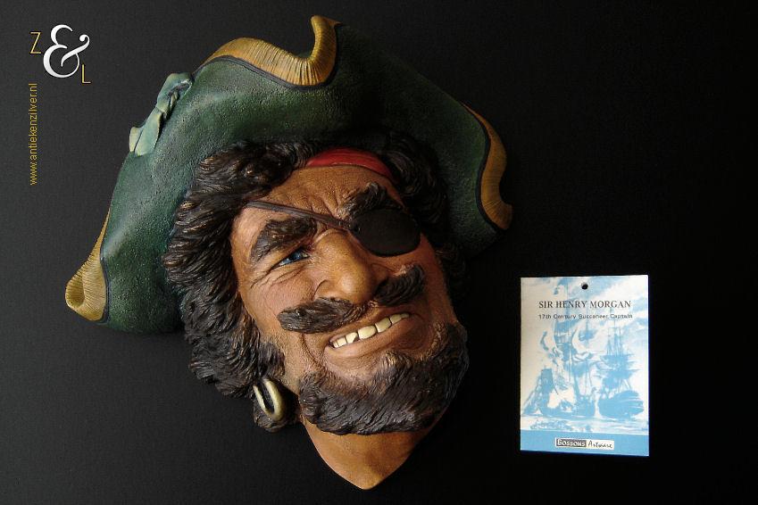 Dit gipsen / Vitreplas beeld / plastiek / wandmasker model Sir Henry Morgan is gemaakt door de W.H. Bossons Company in Congleton Cheshire Engeland. Het op de hand gegoten polychroom beschilderde wandmasker dat tweemaal met een harde matte lak is afgewerkt is gecreëerd door de kunstenaar / beeldhouwer Alice Brindley en was van 1985 tot 1996 in productie. Op de achterzijde staat “Bossons Congleton England World Copyright” en is het etiket geplakt met “Sir Henry Morgan 17th Century Buccaneer Captain”. Aan de onderzijde staat het “Copyrightteken 1982 met daarnaast Bossons England”. Tevens heeft het wandmasker het originele label “Sir Henry Morgan”. Het wandmasker weegt 950 gram is 18 cm hoog bij 19.4 cm breed en heeft aan de achterzijde héél lichte gebruikssporen (slijtplekjes van het ophangen).