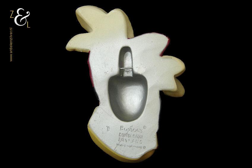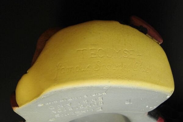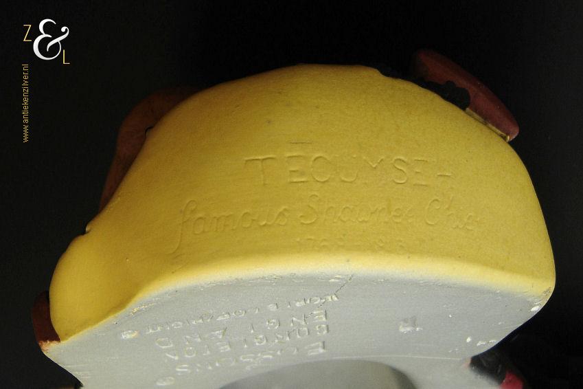 Dit gipsen / Vitreplas beeld / plastiek / wandmasker model Tecumseh is gemaakt door de W.H. Bossons Company in Congleton Cheshire Engeland. Het op de hand gegoten polychroom beschilderde wandmasker dat tweemaal met een harde matte lak is afgewerkt is gecreëerd door de kunstenaar / beeldhouwer Fred Wright en was van 1962 tot 1996 in productie. Op de achterzijde staat “Bossons Congleton England World Copyright” en aan de onderzijde staat “Tecumseh – Famous Shawnee Chief 1768-1813”. Het wandmasker weegt 474 gram is 19.7 cm hoog bij 15 cm breed en heeft aan de achterzijde héél lichte gebruikssporen (slijtplekjes van het ophangen).
