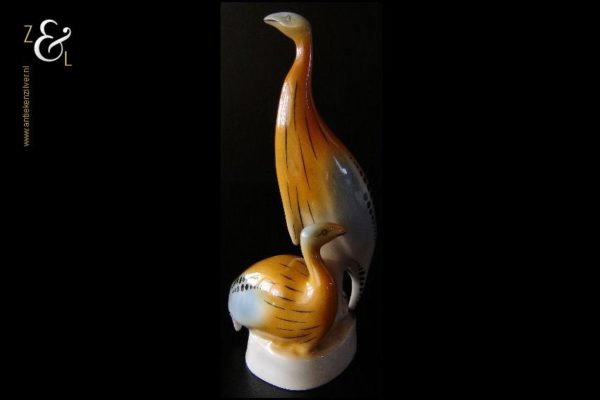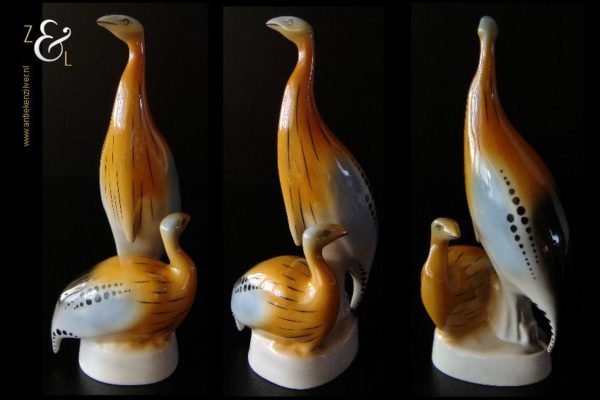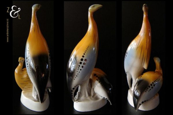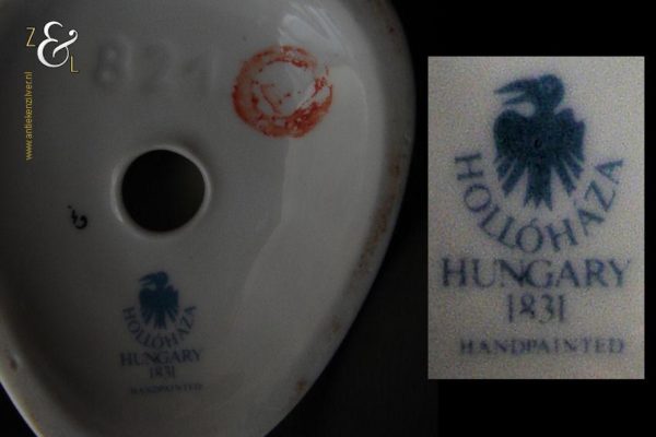 Dit porseleinen beeld / plastiek van twee parelhoenders is gemaakt bij de porseleinfabriek Hollóháza in de plaats Hollóháza te Hongarije. Het beeld is gemerkt in blauw met een adelaar en met Hollóháza Hungary 1831 Handpainted tevens heeft het beeld een blindmerk met het modelnummer 821. Het beeld weegt 263 gram is 19 cm hoog 8.5 cm lang en 7.8 cm breed. De voet is 7.2 cm lang bij 6.7 cm breed.