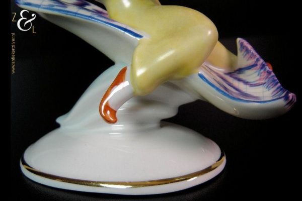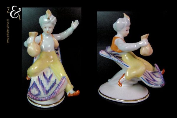 Dit porseleinen beeld / plastiek van Aladdin zittend op een vliegend tapijt is gemaakt bij de porseleinfabriek Hollóháza in de plaats Hollóháza te Hongarije. Het beeld in de Art Deco stijl is gemerkt in groen met een dennenboom en met Hollóháza Kezzel Festett 1831. Het beeld weegt 227 gram is 12.5 cm hoog en de voet is 9 cm lang en 6 cm breed.