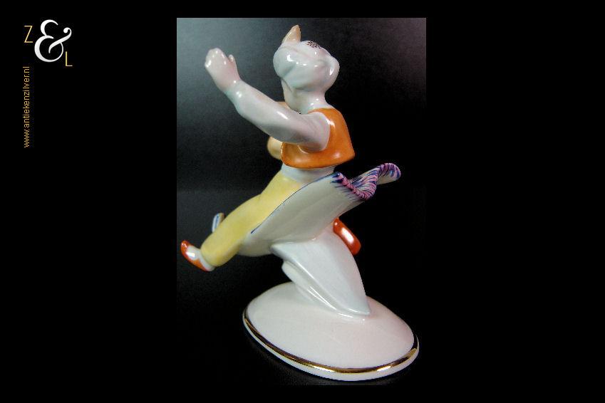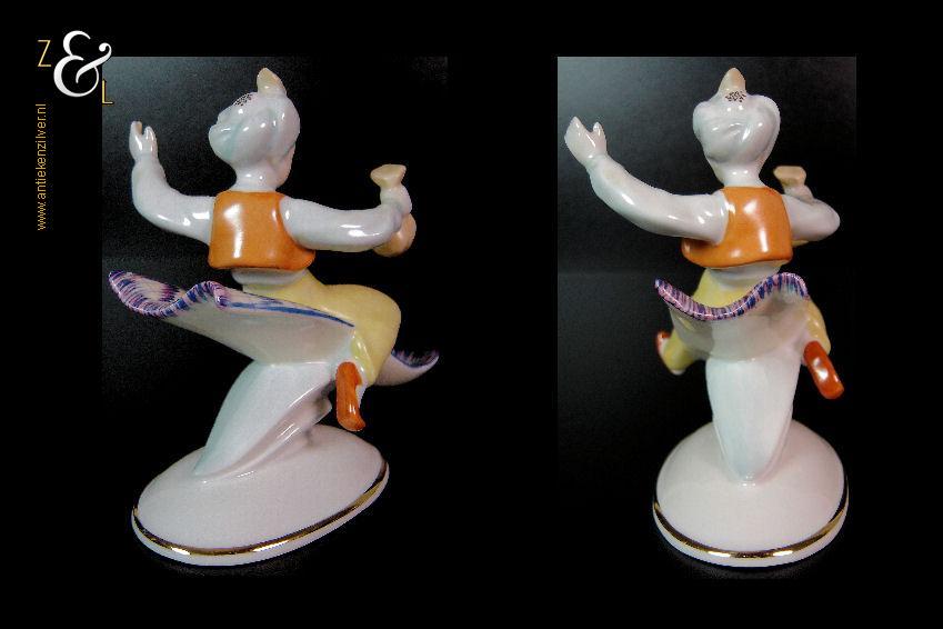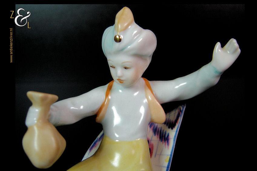 Dit porseleinen beeld / plastiek van Aladdin zittend op een vliegend tapijt is gemaakt bij de porseleinfabriek Hollóháza in de plaats Hollóháza te Hongarije. Het beeld in de Art Deco stijl is gemerkt in groen met een dennenboom en met Hollóháza Kezzel Festett 1831. Het beeld weegt 227 gram is 12.5 cm hoog en de voet is 9 cm lang en 6 cm breed.