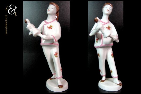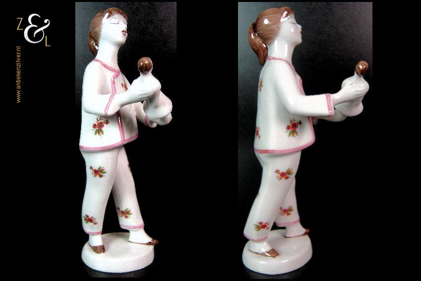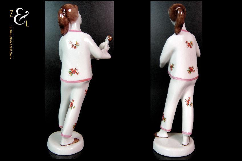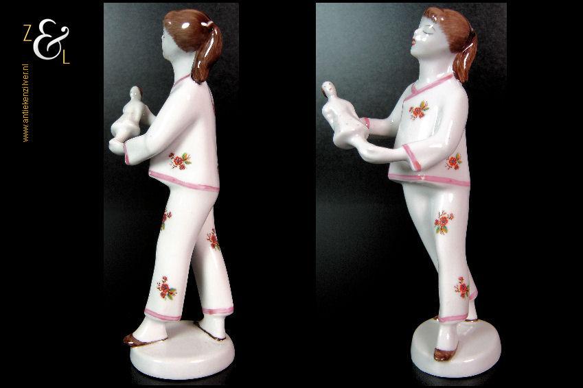 Dit porseleinen beeld / plastiek van een meisje in pyjama met pop is gemaakt bij de porseleinfabriek Hollóháza in de plaats Hollóháza te Hongarije. Het beeld in de Art Deco stijl is gemerkt in groen met een dennenboom en met Hollóháza Hungary 1831 18. Het beeld weegt 131 gram is 16.6 cm hoog en de voet is 5.1 cm lang 4.6 cm breed.
