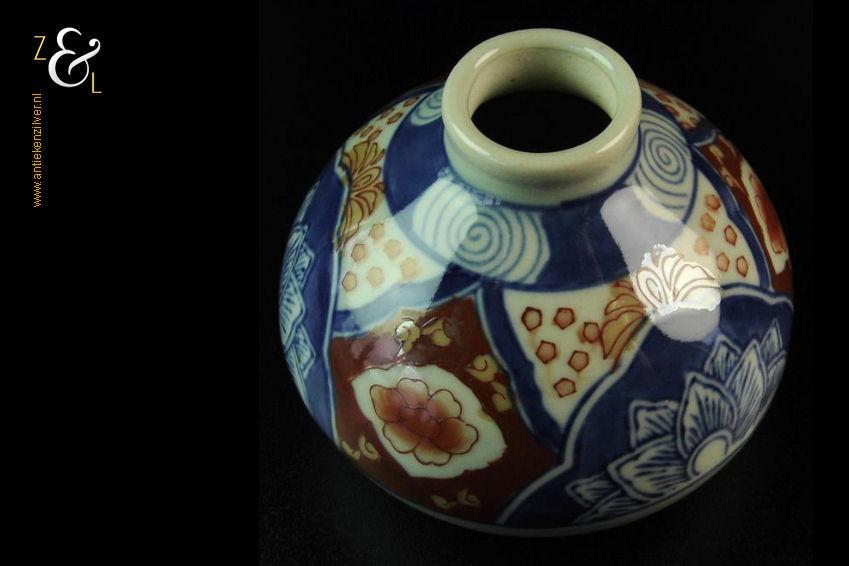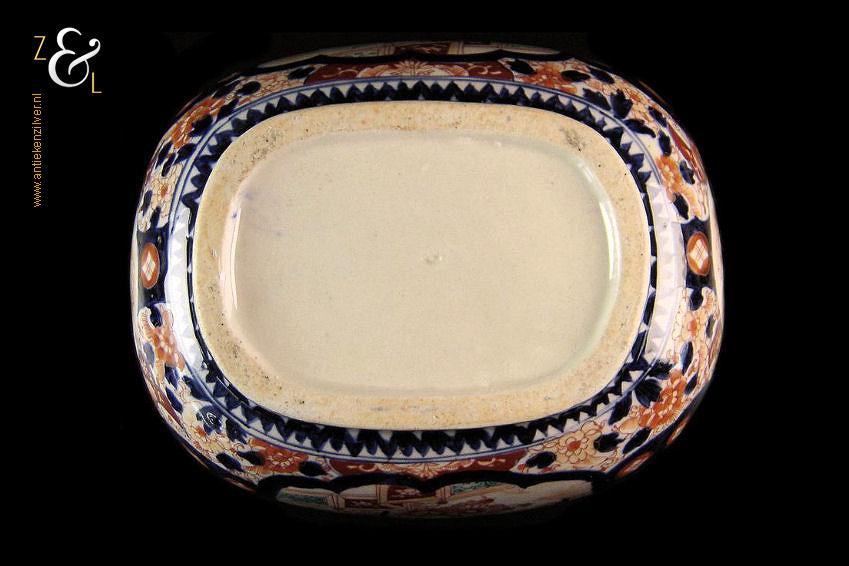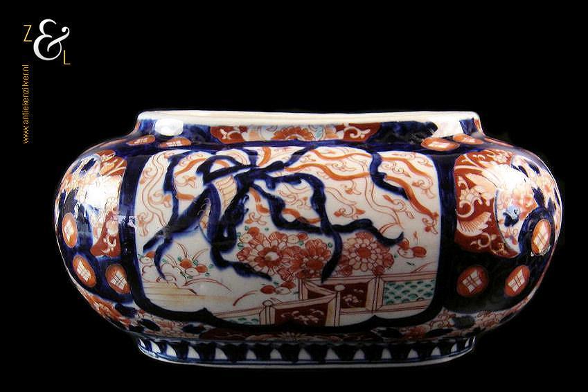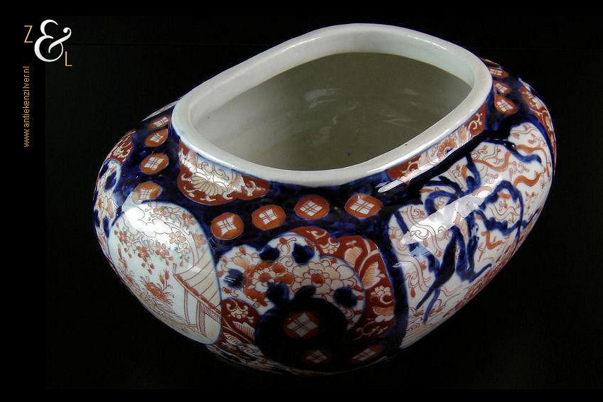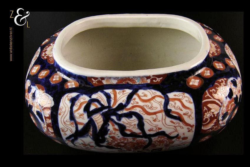Deze rechthoekige porseleinen Japans Imari bloempot is geheel gedecoreerd in de typische Imari kleuren en geschikt voor bijvoorbeeld een bonsaiboompje of orchidee en stamt uit de 19e eeuw. De Imari bloempot weegt 1913 gram en is 27.5 cm lang 22 cm breed en 12.5 cm hoog.